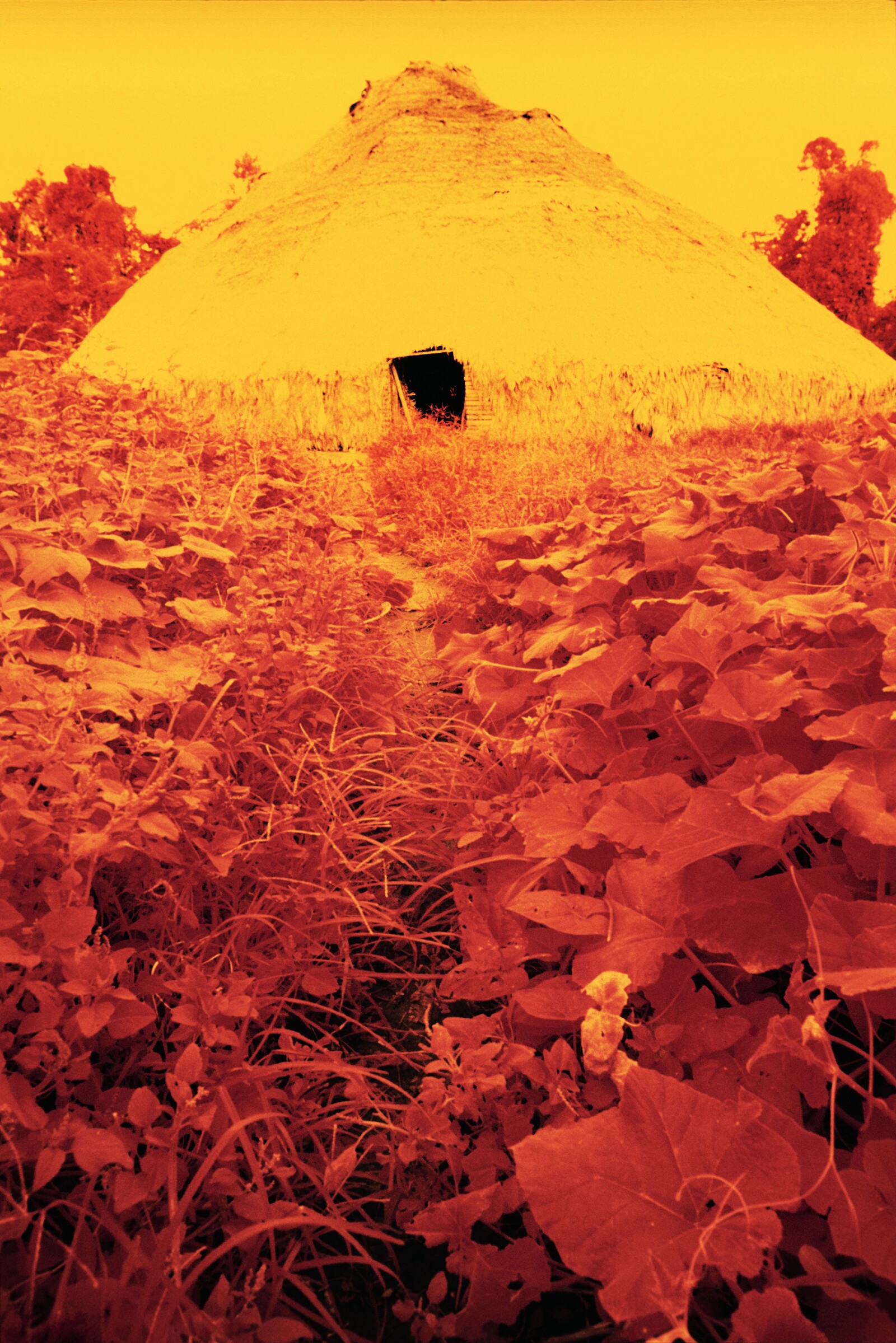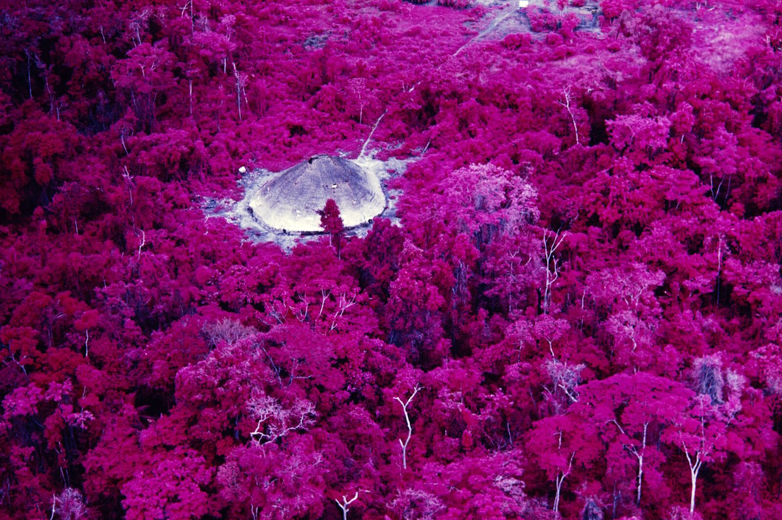 From this opening, the exhibition is plotted by descriptive chronologies, as time periods match up with themes: “Rite and Invention,” “In Search of an Identity,” “From Art to Activism.” It opens with a selection of Andujar’s most emblematic and eye-catching photographs: documentary mixed with sensory interpretation of elements of Yanomami cosmology, including their origin story, which involves the procreation of a demiurge and an aquatic monster, and the existence of the xapiripë, or spirit guide of the forest, which can be accessed through shamanic rituals and the ingesting of yakona, a hallucinogenic powder. The images employ a variety of techniques: wide-angle lenses; infrared film (the documentary use of which was recently repopularized by Richard Mosse’s portraits of the Eastern Congo), which show the forest in bright pink saturated hues; and color filters, which bathe images in yellows, ambers, and rich blues. Andujar’s experiments with exposures and manipulation on the lens, meanwhile, can distort or soften the image. In some examples, she adds a halo around a subject to augment the shamanic trances present in the rituals she records.