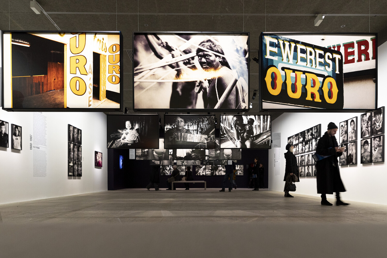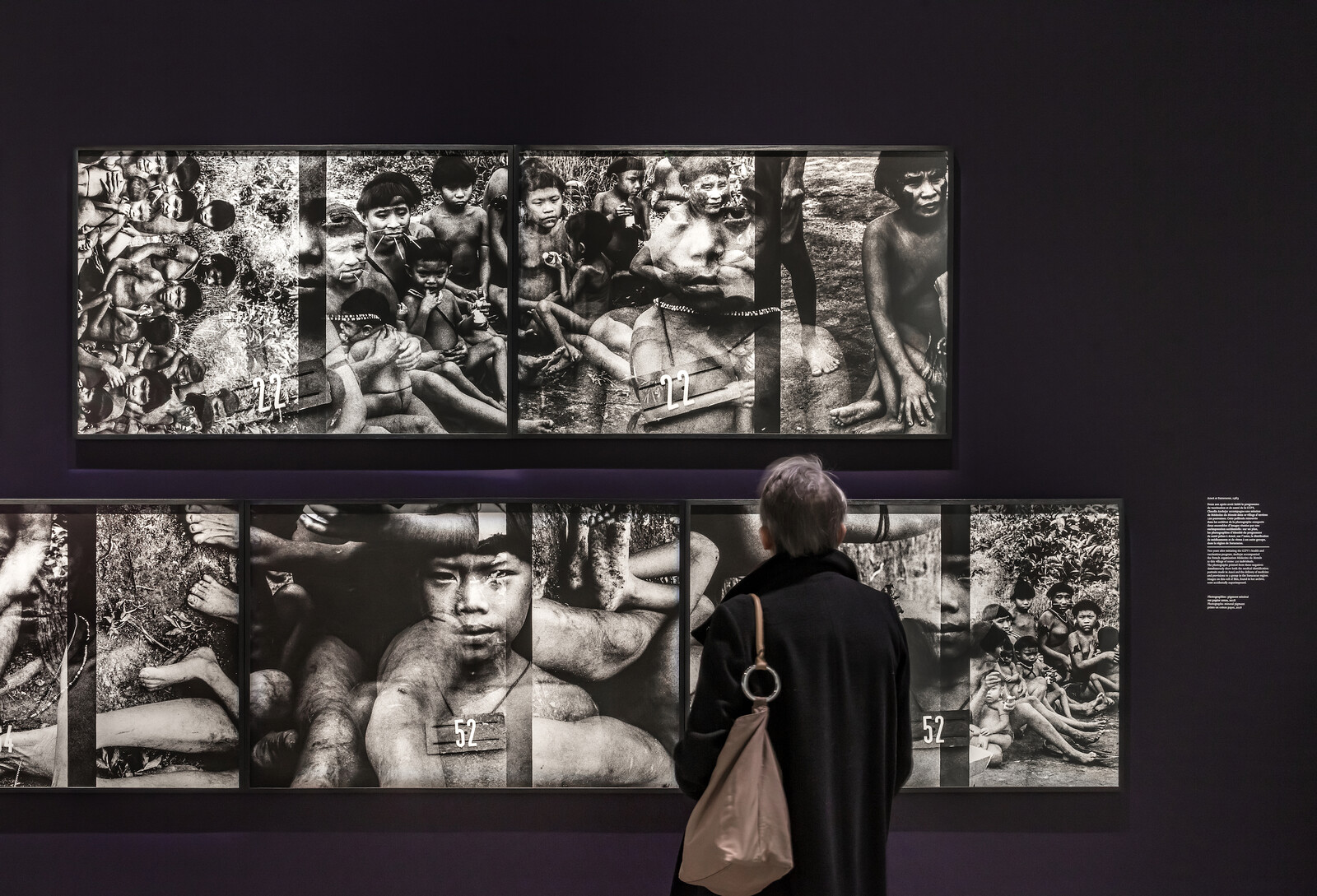 Fondation Cartier’s retrospective “The Yanomami Struggle,” which was first initiated by Instituto Moreira Salles, São Paulo, traces Andujar’s relationship to the Yanomami, and presents a biographical, anthropological, and psychological portrait of Andujar herself. Born in 1931 in Switzerland to a Swiss mother and Hungarian Jewish father, and raised in Transylvania, Andujar fled Europe in 1946, after having lost her father and many members of her extended family to concentration camps. She travelled first to the United States, where she began developing her artistic practice, and in 1955 relocated to Brazil. There, she became a photojournalist, focusing on marginalized communities, including small towns and indigenous territories: she first visited the Yanomami on assignment in 1971. From that point on, documenting, understanding, representing, and defending these people became a major project that continues to the present day. Andujar’s mediating identity, as a European outsider negotiating between a development-obsessed modern Brazil and the indigenous communities, is a theme that subtly weaves through the show alongside personal details, which suggest a traumatic link between Andujar’s early history and the threatened existence of the Yanomami.