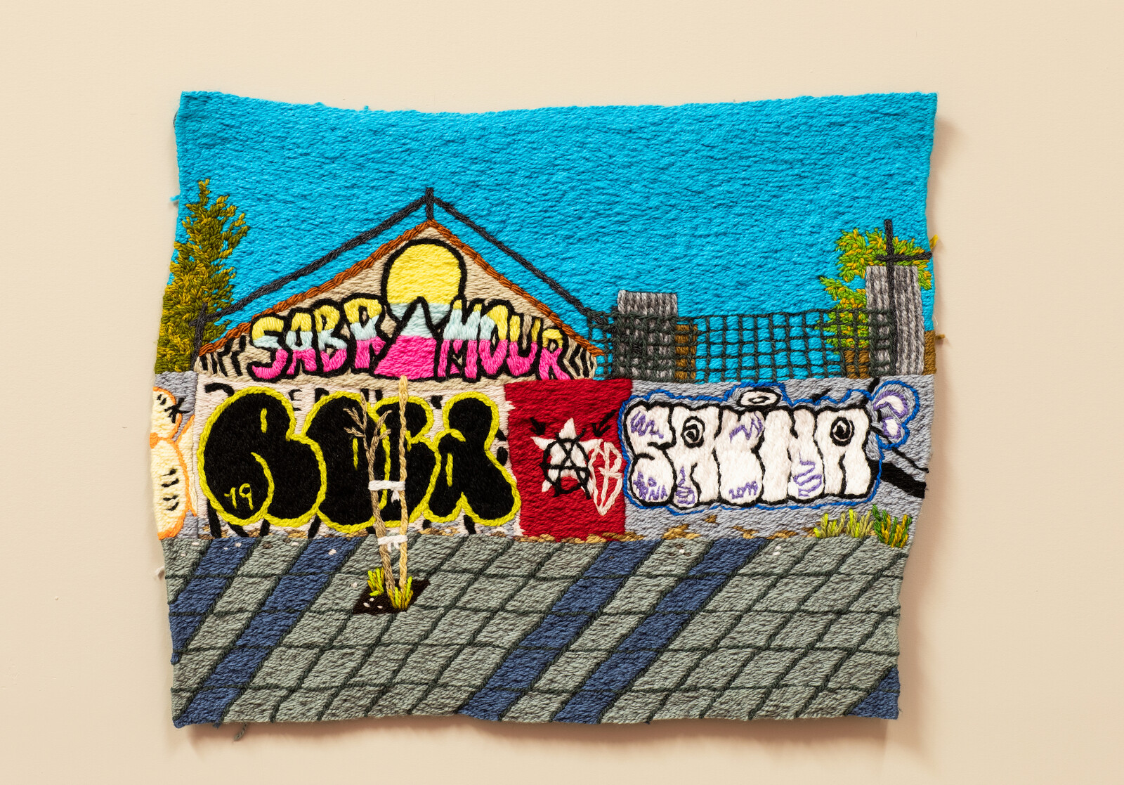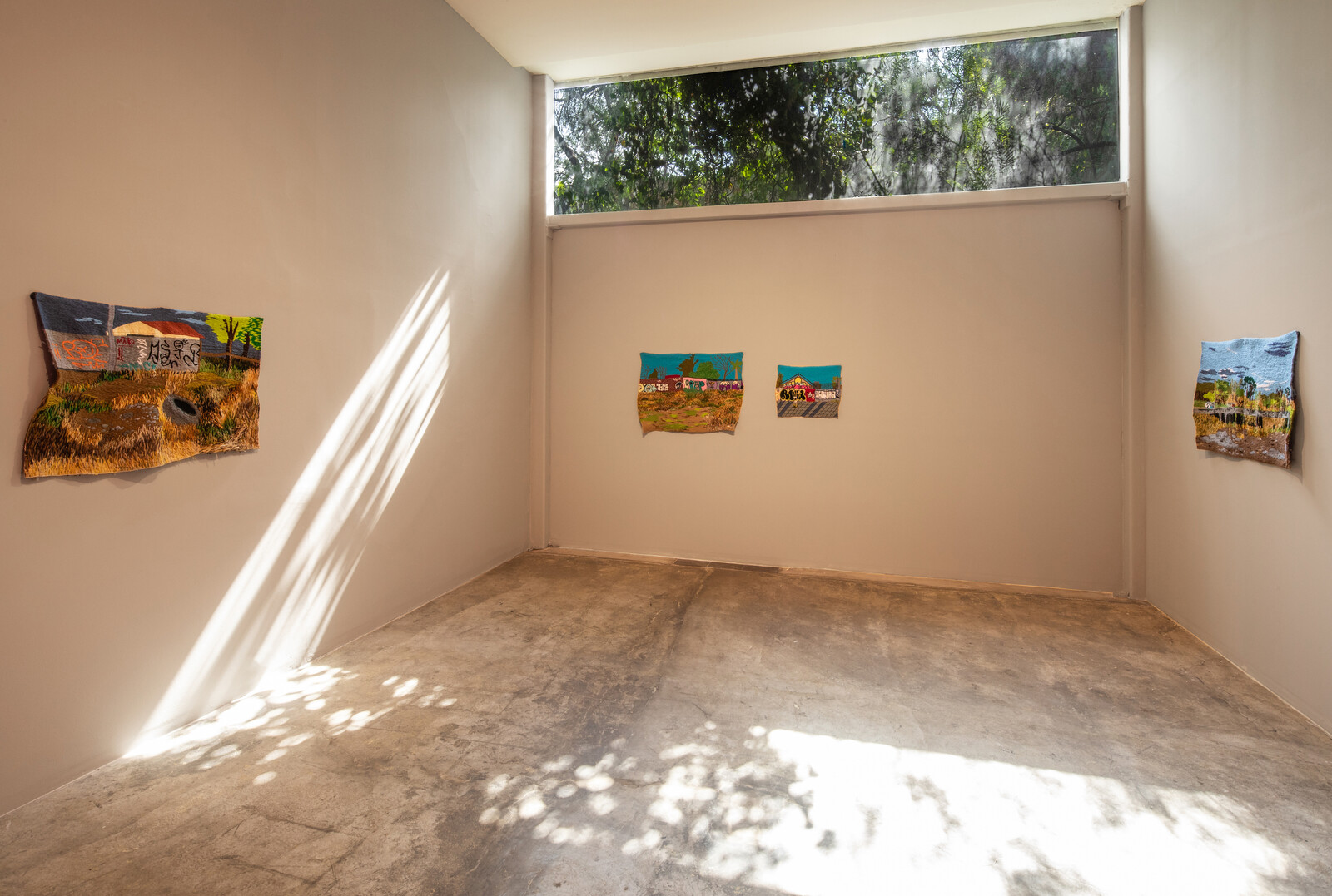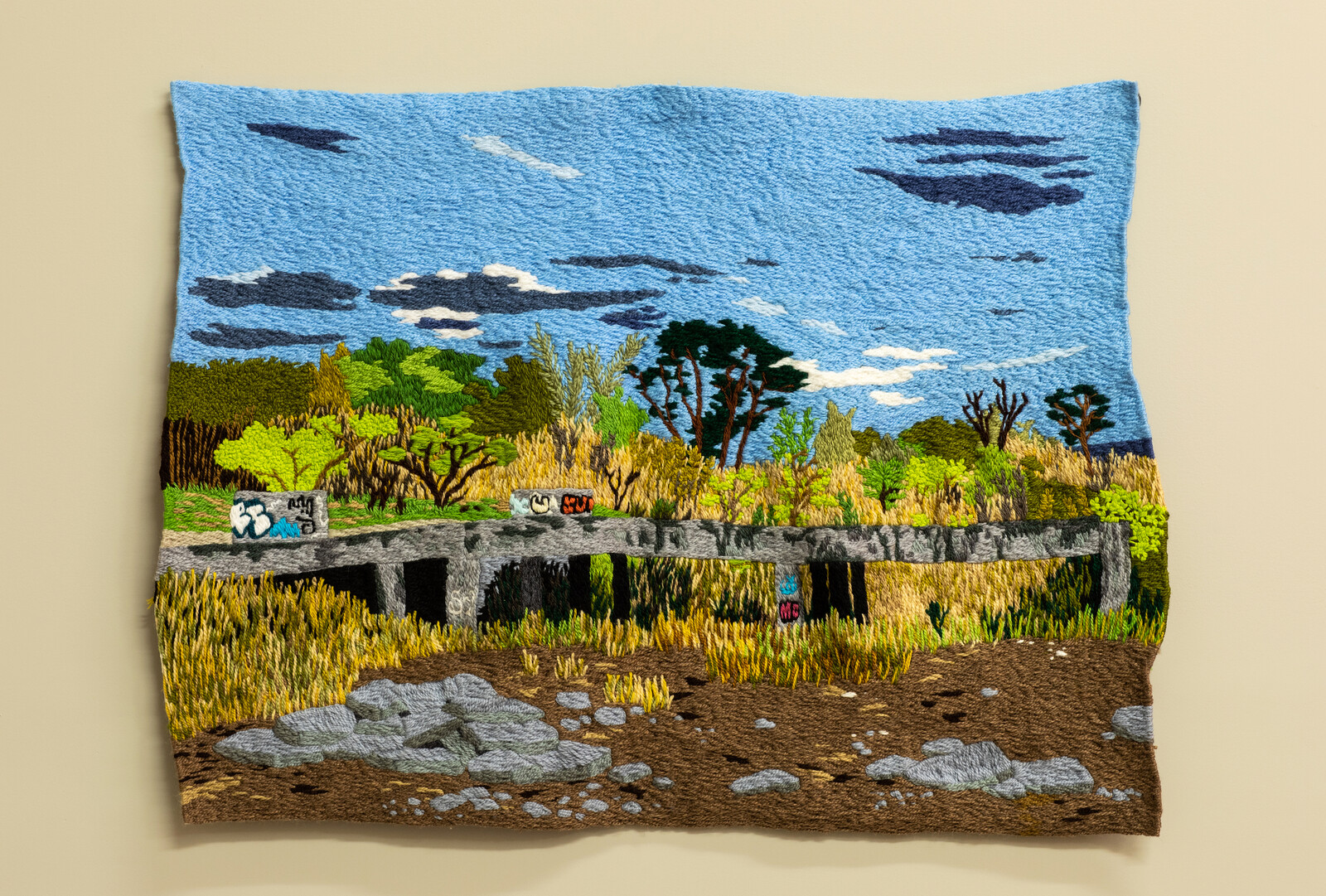 In one of the two 2020 works whose shared title lends the show its name, Gutiérrez Marfull represents an overpass leading nowhere atop a dry stream bed using tight, colorful stitches. The weeds are tall, the concrete bridge mossy. Graffiti dots the area, as do a few trees. A few dark, elongated clouds cross the blue sky. In the second embroidery of the same title, a graffitied concrete wall obscures everything but the red roof of a beige building standing in the background. Beneath the gray sky, a couple of yellow trees sit in the corner. Brown, overgrown weeds and dirt dominate the foreground; the central feature is an old tire leaning on the ground. The composition is similar in the companion piece. Here, the work is divided into three horizontal sections. Along the top, a bright teal sky is interrupted by various trees. Across the middle is a ribbon of graffiti: a few bubble tags on a brick wall, a purple cartoony face and the letters AC—almost certainly the first half of an ACAB—with a classic anarchist circle-A. The foreground, taking up half of the image, is again dirt and weeds in different hues of dry.