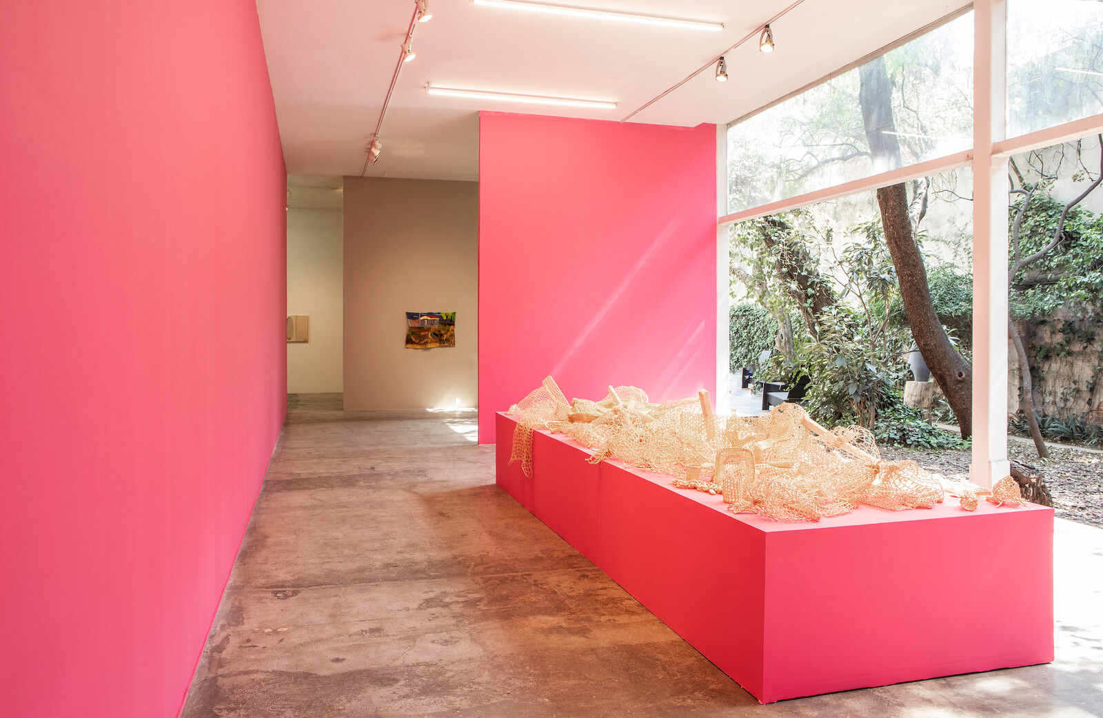 A complement to these works, Poco se gana hilando, pero menos mirando (Little is earned by weaving but even less by looking, 2016–21), sits in another room on a long rectangular plinth painted, like the rest of the room, a bright pink. On the plinth are dozens of bendy, woven shapes. Some of them are modest: the silhouette of a broken bottle, a knife rendered in minuscule stitches, a belt, a segment of a chain, an extension cord. It wasn’t until I noticed the telltale car tire—deflated and mid-collapse—that it clicked: the piece is a time-consuming imitation of trash recreated in crochet. The silhouettes of interlocked cotton were infused with resin in order to retain their shape, but their flimsiness won in the end. When I saw them, they had wilted into a curious mass.