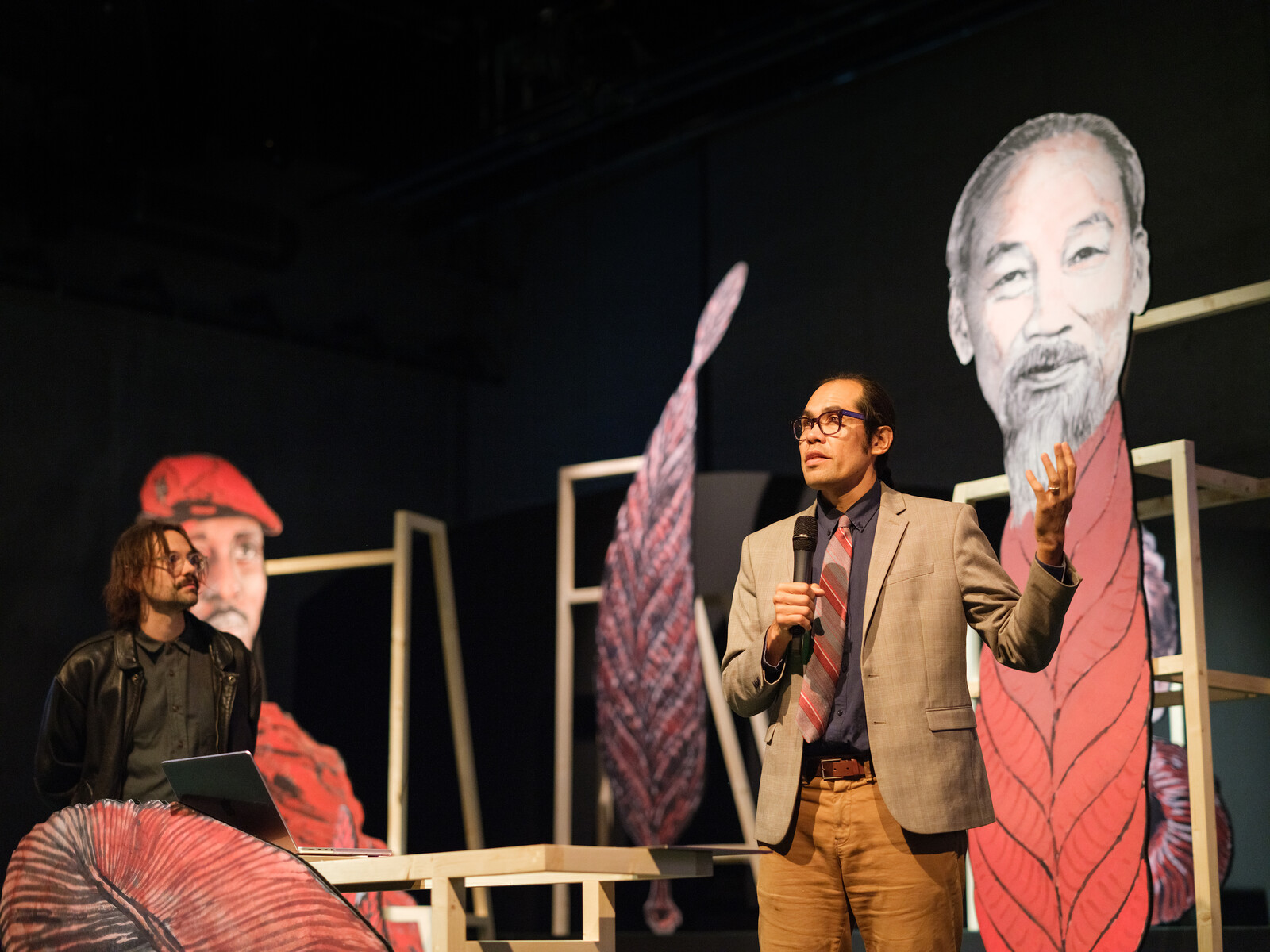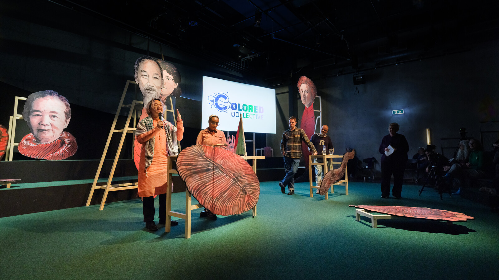 That unshakable hope mirrored the will of artists, activists, cultural workers, theorists, and organizers who gathered in an aqua-carpeted “immersive diorama” to imagine ways of propagating radically egalitarian futures in an increasingly asymmetric present. Designed by Staal to invoke the Neoproterozoic Era’s Ediacaran period, described by geologist Mark McMenamin as a “pre-socialist socialist ecology,” giant painted biota adorned wood-frame podiums and stands around the auditorium, with larger specimens bearing the heads of historical revolutionaries like Ho Chi Minh, Eleanor Marx, and Thomas Sankara, to visualize the deep time of collective struggle.