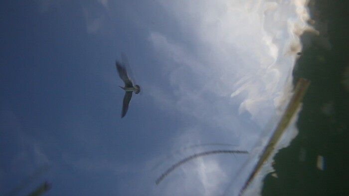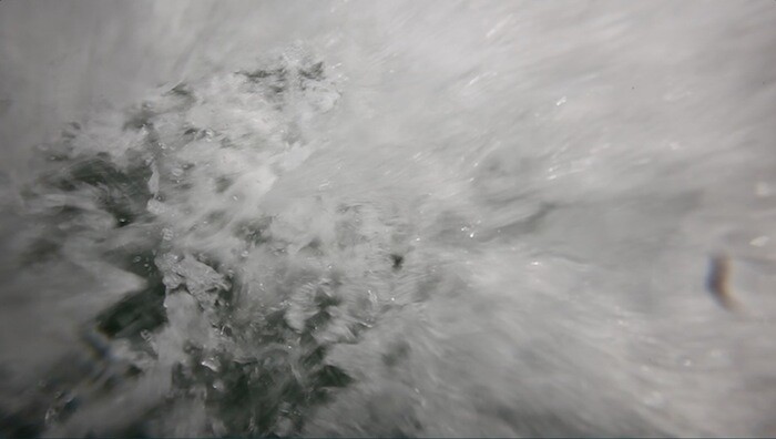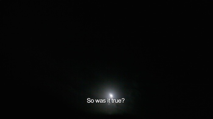The riskier voyage is recounted in the parallel narrative delivered in Spanish by a man and a woman. It is, they tell us, “a story of sadness filled with pain.” Sharks follow their raft its entire journey, and they encounter signs of others’ unsuccessful voyages (an abandoned raft, a child’s dismembered arm). The male narrator often tells his story in a magical realist register: before starting his voyage he learns to swim on dry land, “because you are already drowned;” as the story ends, he seems to hallucinate, his legs becoming an island, his eyes blooming with roses, and sand filling his chest. His voyage concludes in a visionary death, suggestive of a new, transfigurative beginning. The video concludes as a fable with the migrant’s words: “lying down as islands do, I look to the horizon and ask, ‘So is it true?’”.
