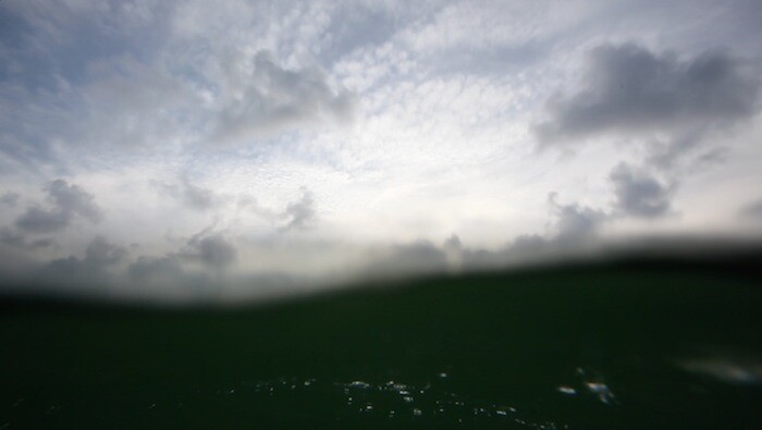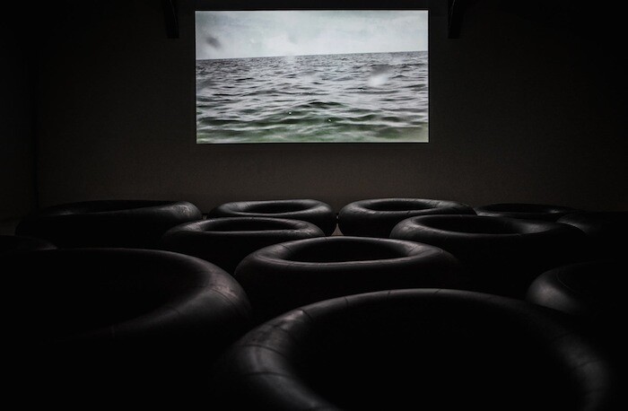 Much is said and little is shown in Coco Fusco’s video installation And the Sea Will Talk to You (2012). We are on a raft, it seems, adrift in the middle of the Florida Straits, the camera dipping intermittently below the turquoise waves and back up to a blank horizon. A watery soundtrack washes back and forth rhythmically. The video’s narrative is told through first-person voice-over accounts in English and Spanish that detail two journeys heading in opposite directions: a family flees from Cuba to Florida on a rickety sea-going vessel; an American-Cuban woman—much like Fusco—catches a series of flights to return her mother’s ashes to the island. While the female narrator worries about being caught out and having her mother’s remains confiscated, the emigrant family contemplates sharks, uncertainty and death. The viewer is placed in the latter’s position, both in the point-of-view of the camera, and in the installation itself. On the gallery floor, in front of the screen, are an array of black rubber rings, the pungent inner tubes of tractor tires. I plonk myself into one. It’s uncomfortable—which is, no doubt, the point.