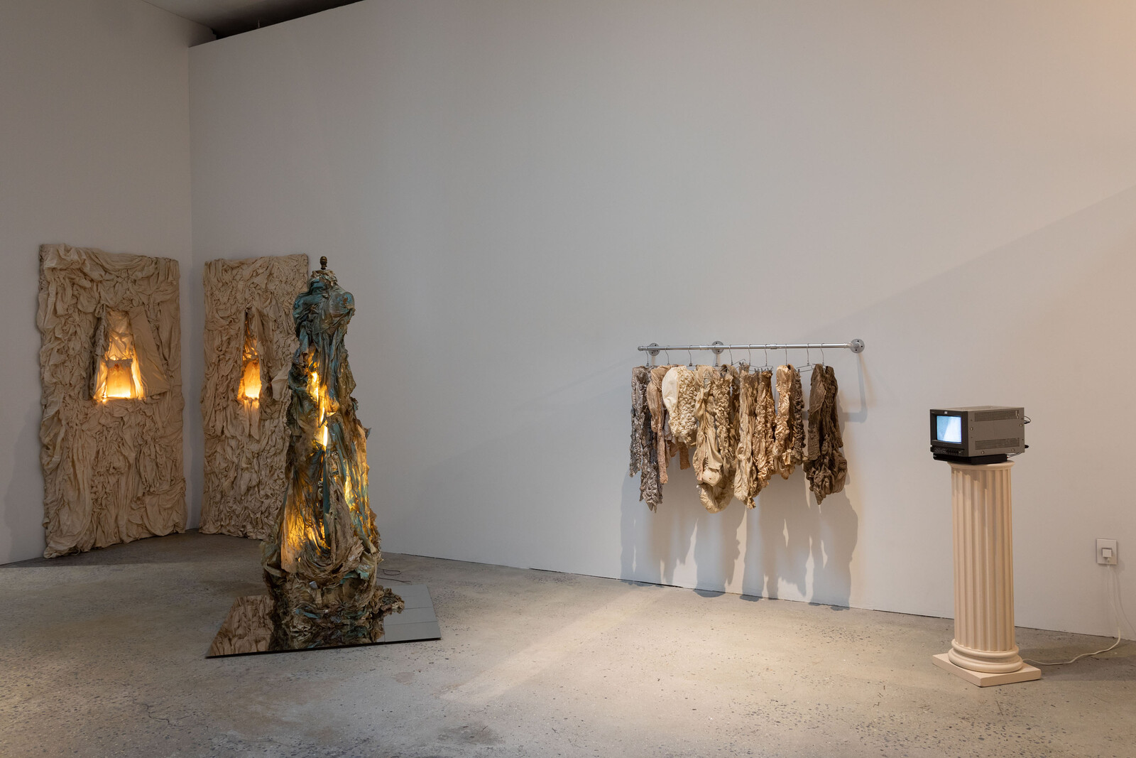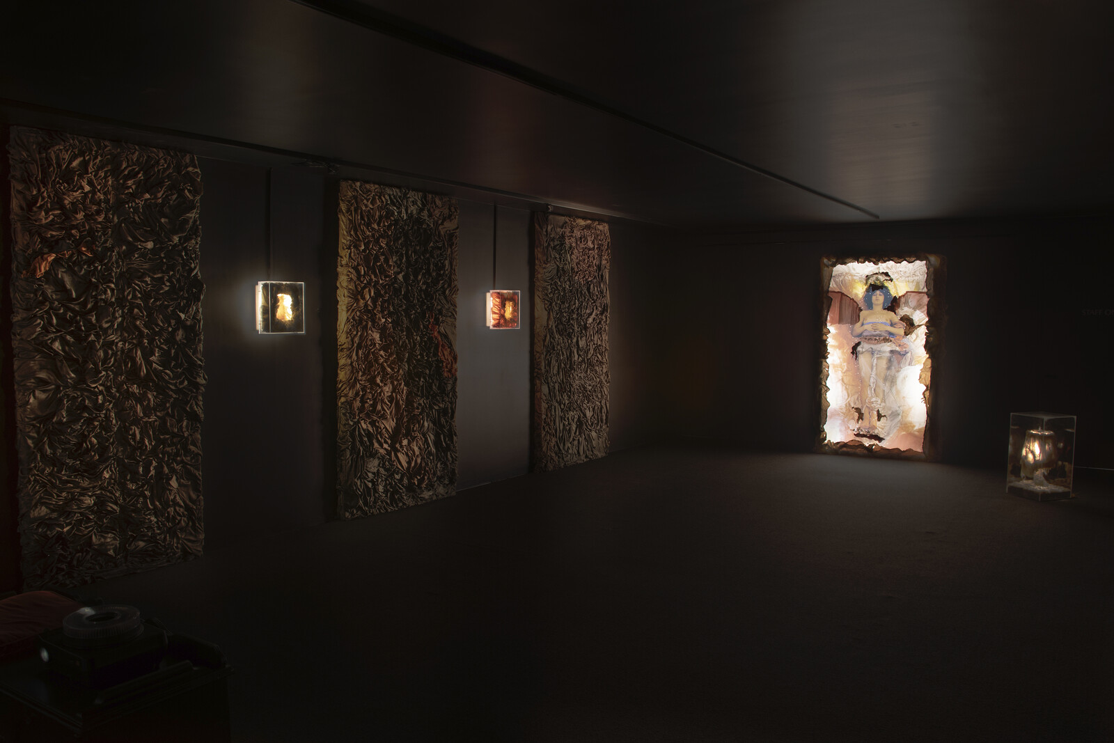 Curator Kenta Murakami takes obvious delight in displaying various artifacts from this riotously productive period in Colette’s creative life. The centerpiece of the exhibition, Notes on Baroque Living (Installation), 1978–83/2021, reconstructs Colette’s fabric-draped Pearl Street loft and includes a life-sized doll replica of the artist, created by sculptor Cajsa von Zeipel. This installation is flanked by Colette’s vintage output of the 1970s, including original photographs documenting various performances with handwritten captions. More successful are her sculptural lightbox objects, in which Colette embeds photographic images of herself in various guises and envelops them in swathes of fabric.