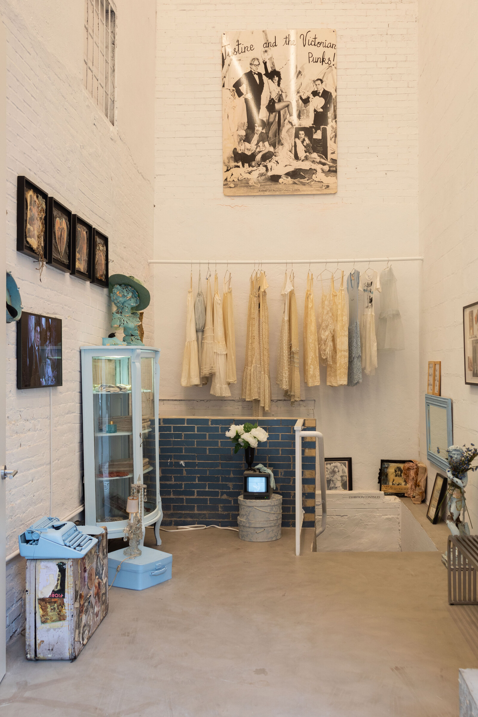 Although she works across mediums, Colette’s oeuvre primarily revolves around the creation and packaging of her own personae. For most of the 1970s she worked under the mononym Colette—her real first name, given in homage to the French writer Colette (who herself worked under noms de plume). In early 1978, she staged Colette’s death in a performance at the downtown Whitney Museum branch. She resurrected herself, in a second performance at PS1, as Justine: the executor of the Colette Is Dead Co. and the frontwoman of the band Justine & The Victorian Punks. (She took on the moniker Colette Lumiere in 2001, after cycling through alter-egos such as Mata Hari and the Stolen Potatoes, and Countess Reichenbach.) With her punkish shock of dark hair, angular face, heavy makeup, and strategically distressed, ultrafemme clothing, Colette/Justine anticipates Vivienne Westwood’s New Romantic silhouettes of the early 1980s and Madonna’s breakthrough “Like a Virgin” look. (Colette and the Material Girl, both regulars at venues like the Mudd Club and Danceteria, must have crossed paths.) This show contains a fraction of the work Colette made to enshrine these personae, from sculptures and collage to records and limited-edition dresses.