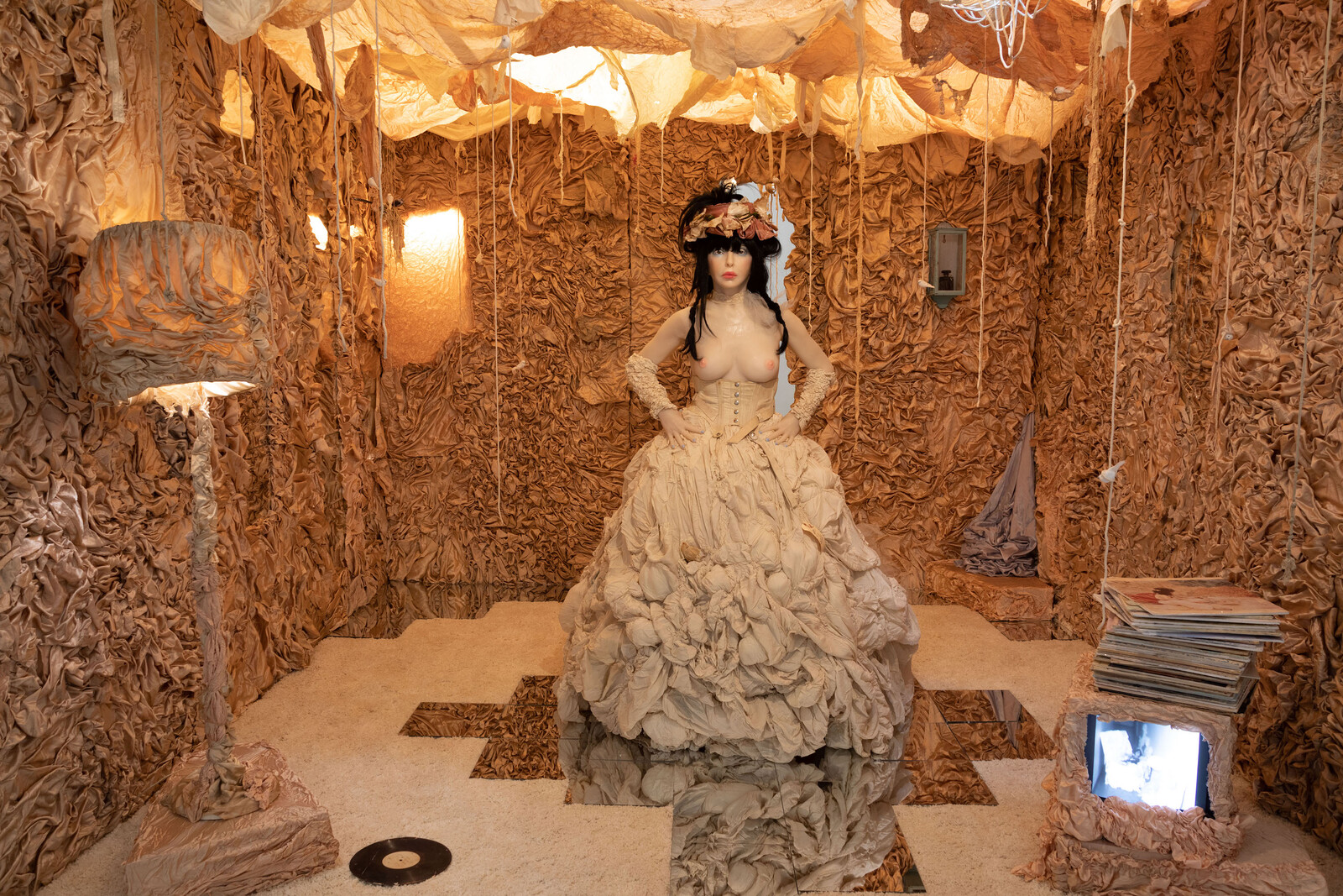 This exhibition focuses on the fruitful period of 1972 to ’83. At the show’s core are garments and artifacts from her Living Environment, staged in her Wall Street–adjacent loft during these years. There, Colette suspended satiny ruched fabric in unabashedly feminine shades of blush and cream from every available surface. The look was described by one writer as “suffocating voluptuousness”—a phrase that recalls the fleshiness of the feminized body and the trappings to contain it, from frilly dresses and bedclothes to gussied-up caskets. Colette’s interior design vision extended to matching garments like bodycon dresses and tiered leggings. She sewed both a personal capsule wardrobe and limited-edition fashion collections.