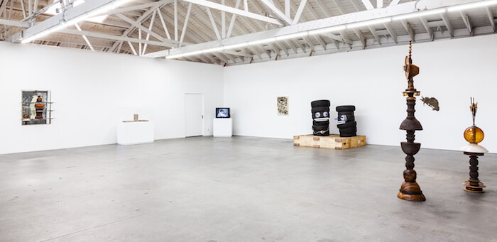 This much is the moral of Sterling Ruby’s Transient Trilogy (2005-2008), a video in which the artist himself plays a homeless person shuffling through the LA brush, compiling little bricolage sculptures from tinsel, hair ties, and pinkish goo. “I am an interior burnout,” says the detuned voiceover, “with an outside rainbow.” At least Ruby goes into the weeds himself, rather than gawking (although, when it comes to elective vagrancy as art, One Year Performance 1981–1982 by Tehching Hsieh remains the limit case); Ruby also parodies a certain type of artist (perhaps he is one himself) that seeks transcendence in precious scraps. The show relies on similar gestures toward junk art or found urbanism. Some are calculated but effective, such as Jedediah Caesar’s Mohave Laminates (2017): amber resin embedded with old plywood and other weathered objects then shaved into wall works. Others, like Kim Gordon’s Untitled (2017), a stick wrapped in gold lamé, seem plain silly.