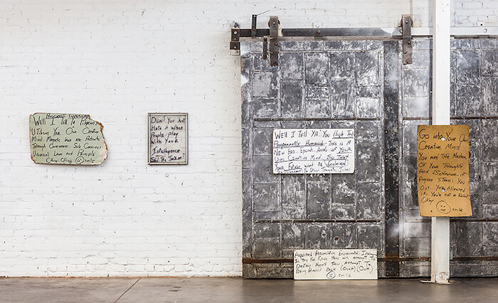 Word on the street is they got the Crenshaw Cowboy. Into a gallery, that is. Anyone who has turned onto the westbound I-10 at Crenshaw Boulevard has likely noticed him, an itinerant junk-assemblage artist who shows his sculptures at the top of the onramp. He also gives advice on fame and creativity, by way of hand-painted signs—for example, on a curling particle board: “Go into Your Own Creative Mind You are The Master Of Your Thoughts And Behavior. If Anyone Stress’s [sic] You Out… You Allowed it… You’re not a Robot Okay : ) Smile.” Five of these signs appear in “Concrete Island” at Venus, Los Angeles, a show that, by way of J.G. Ballard’s novel of the same name, romances the aesthetic of those who eke out a living in the city’s gaps.