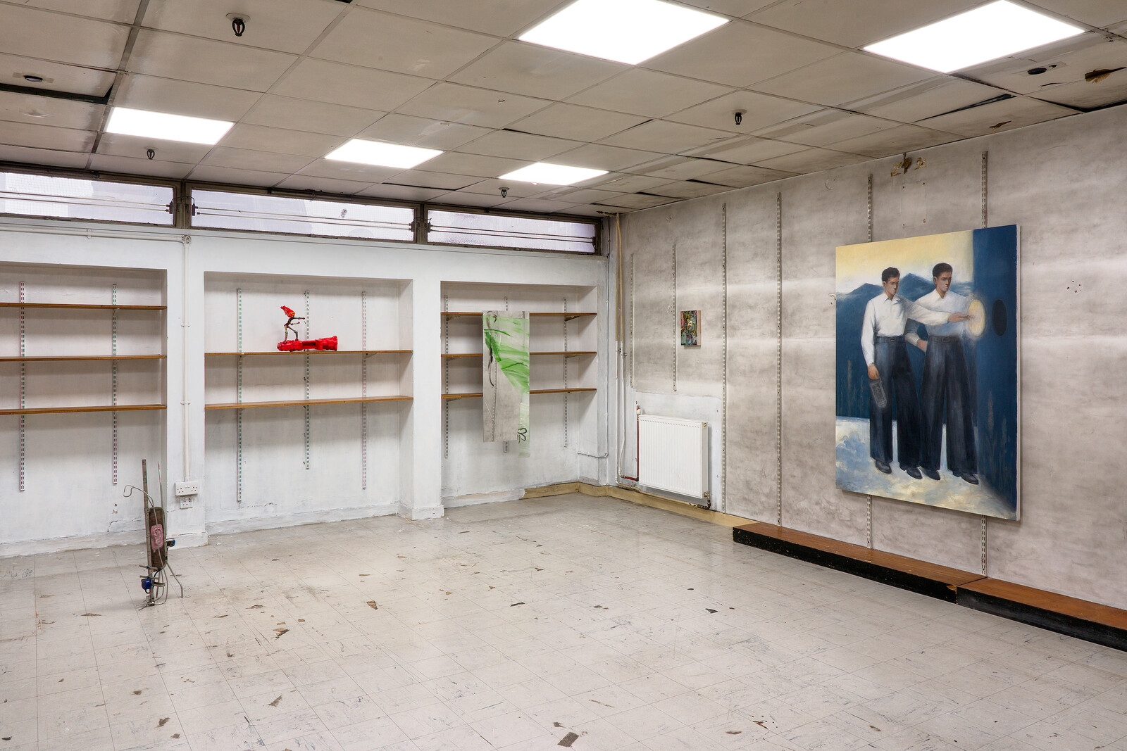 The commercial units in the housing estate where Public Gallery is located used to have an additional floor upstairs, with a separate entrance. These extra rooms were converted into apartments, and the staircases leading to them blocked in cement a few stairs up. Abbas Zahedi’s Weeping Diwani (2020), rendered in anti-climb paint and masking tape on a salvaged boiler panel, is presented in one of these claustrophobic limbo spaces. In the same group show, titled “00:00:01,” Steph Huang’s Prawn Fried Rice (2025) is a small sculpture showing a glass shrimp reaching into two Spam cans filled with rice. Irreverent, yes, but also evidence of how quotidian things carry deep culturally specific meanings, if you pay a lot of attention to them. The textile shop that used to occupy the gallery’s space was called “Hello Dolly,” and its sign, in English and Arabic, remains. It hangs above a site-specific installation in the shop window by Mandy El-Sayegh, a London-based artist of Malaysian-Chinese and Palestinian heritage. It comprises artifacts of personal and symbolic significance—paintbrushes, incense, oranges—with police tape strewn around them. It is completed by another sign: “no aesthetic without my freedom.”