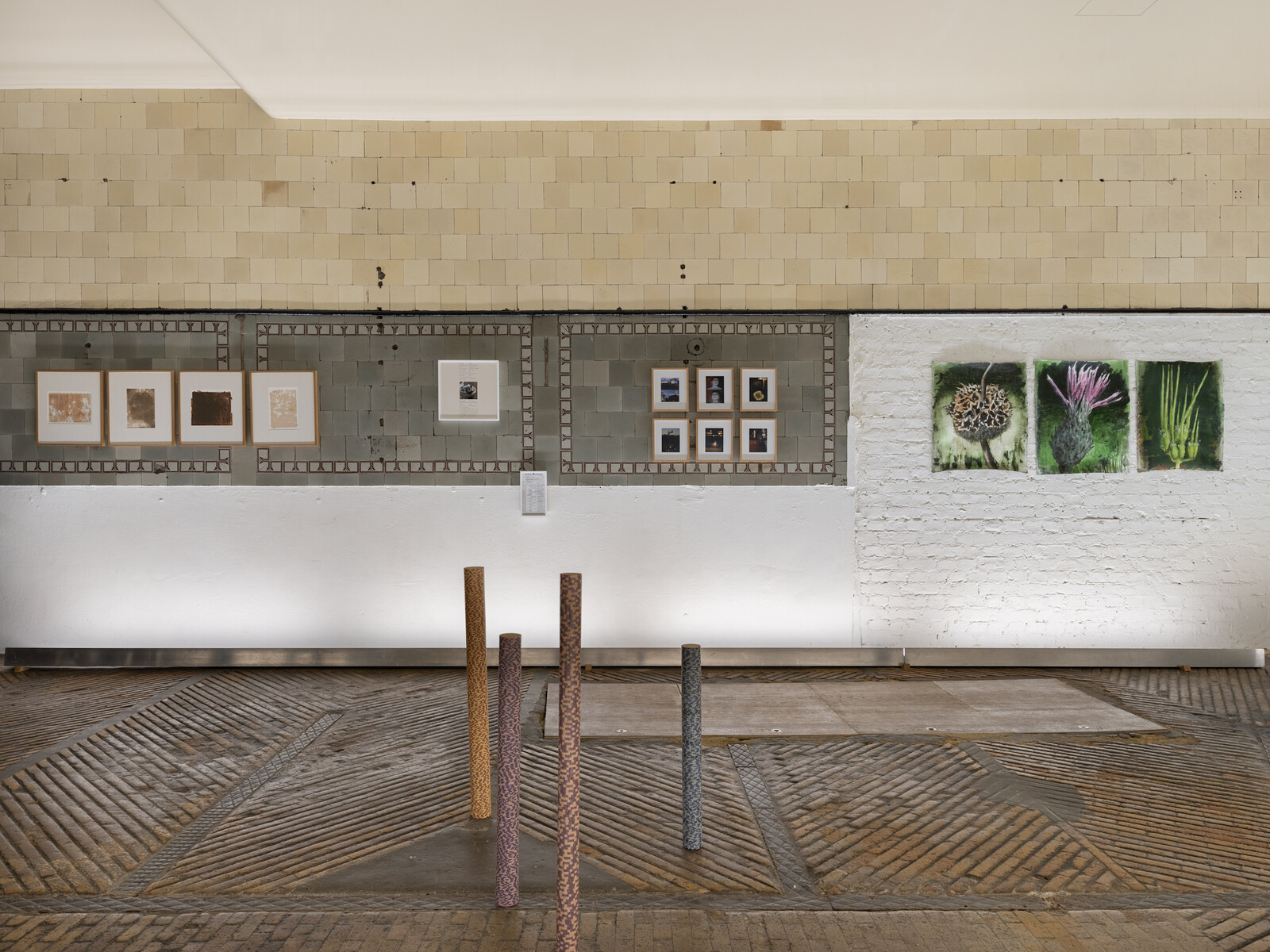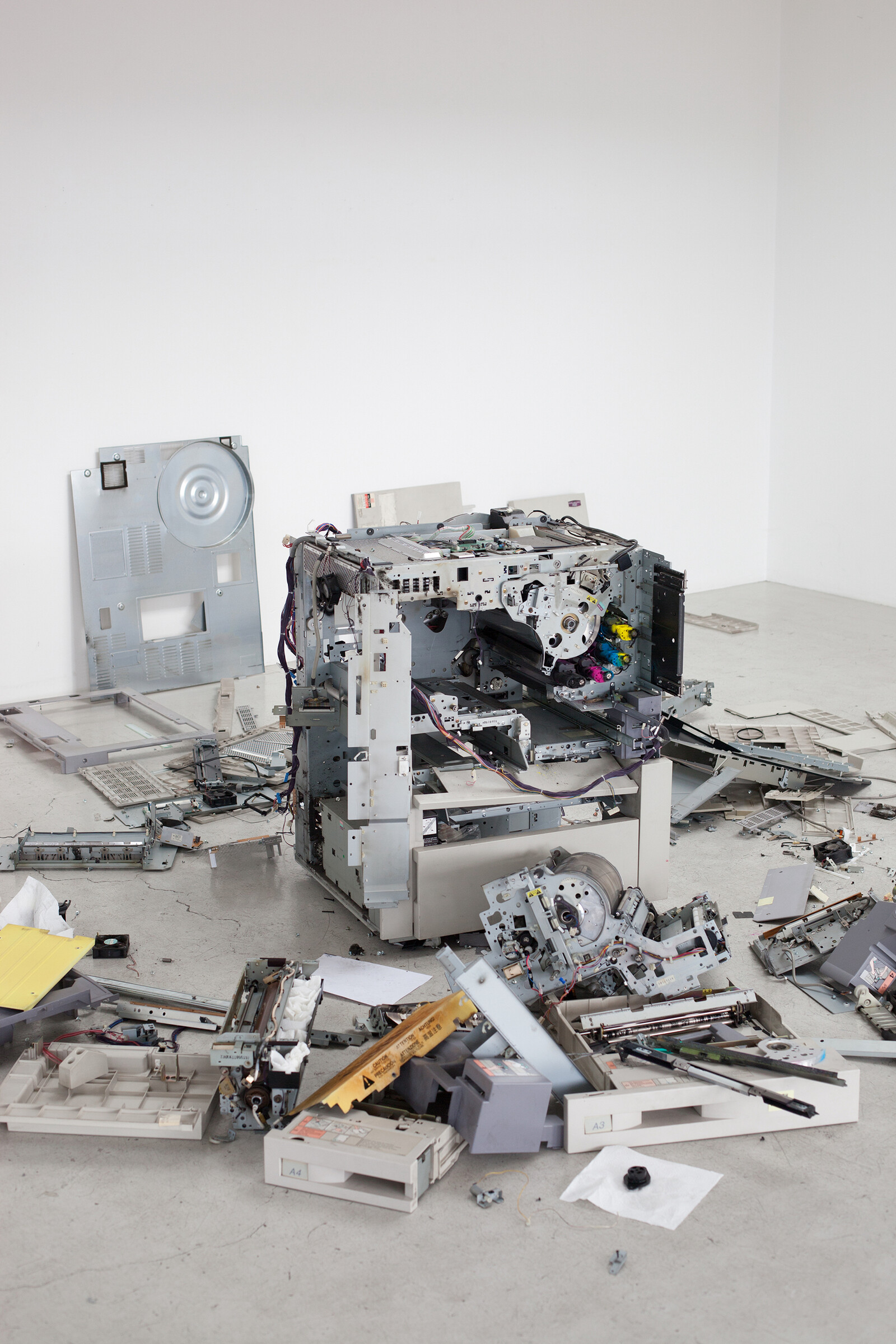 Another pairing that becomes a dialogue is on view at Studio M., where Maureen Paley welcomed Air de Paris. Fourteen framed xerograph prints by Pati Hill—of red petals, a pair of scissors, a single glove—hang facing a Wolfgang Tillmans photograph of a disused photocopier in the artist’s studio (CLC 800, dismantled, a, 2011). The machine is broken up, its insides splayed, dysfunctional but still drawing attention. Together, the works speak of technology and its promises and how, in the eyes of an artist, any image-making mechanism is full of possibility. Some petals printed with red toner, the sight of something bound to fade, in front of a device that can no longer be fixed. Also: all things fail in the end.