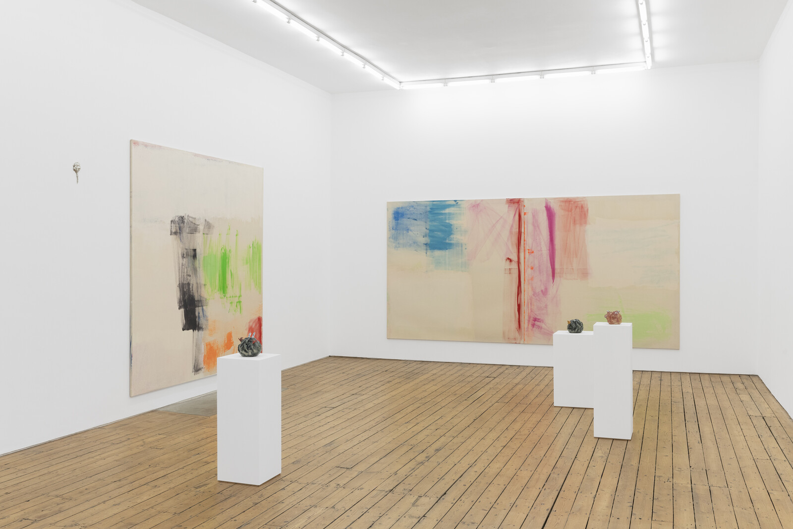 Eight of Zemánková’s flower pieces, which were also shown at the 2013 and 2024 editions of the Venice Biennale, were brought to London by Sophie Tappeiner as part of Condo, a project in which twenty-two London galleries host twenty-seven peer spaces from around the world. The match-ups vary. The Approach handed their annex space to Vienna’s Tappeiner and their upstairs to Zurich gallery Philipp Zollinger, showing huge abstract paintings by Renée Levi and small cartoonlike ceramic-and-tin sculptures by Cassidy Toner. It was a coherent and balanced presentation, if a bit safe: an older and a younger artist, paintings on the walls and sculptures on plinths.