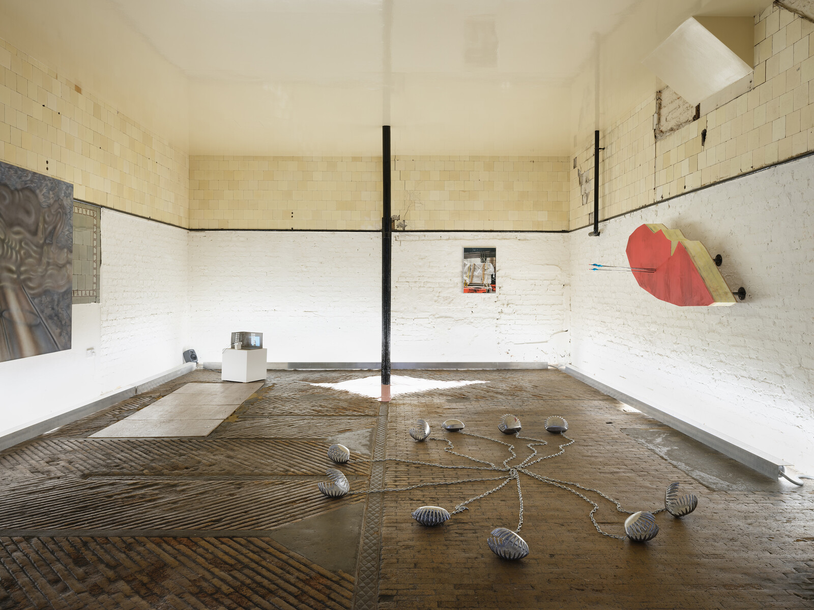 This uneasy simultaneity is visible throughout Condo. At Warsaw gallery Import Export, hosted by Rodeo, the artworks on view discuss war, heartbreak, and climate catastrophe all at once. Just to the left of the entrance is horses [konie] (2023), a large acrylic and ink on canvas by Ukrainian artist Veronika Hapchenko. Based on mosaics from Pripyat, a town that serviced and housed workers at the Chernobyl Power Plant, it’s a grayscale work that reflects on the historic suppression of Ukrainian culture. Across the small space is a collaborative work Drama I (2021) by SAGG Napoli and Stefania Batoeva, a wall-mounted sculpture of half a broken heart with arrows poking into it. On the floor between these two works is Skinscape V. (2024) by Mia Dudek where the Polish, Lisbon-based artist spilled pink silicon on a part of the floor, the result a beautiful disaster. The show is called “Ruined”—by love and politics. In the show, the two are not comparable, but the title serves as another reminder that they coexist.