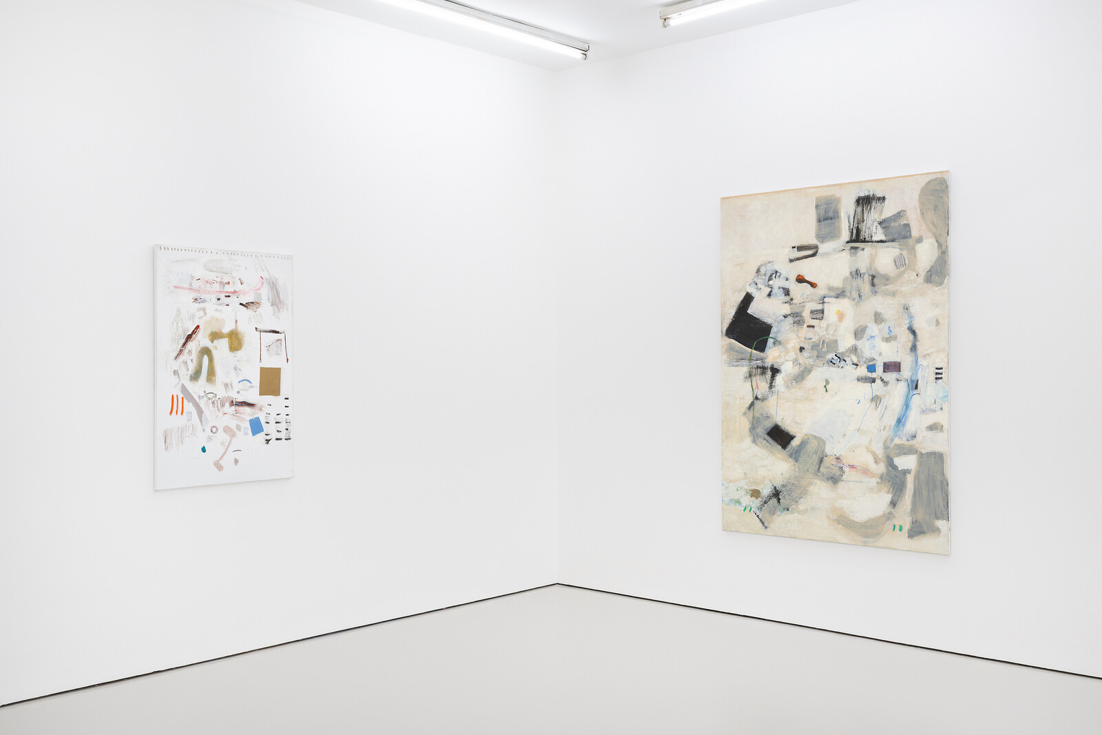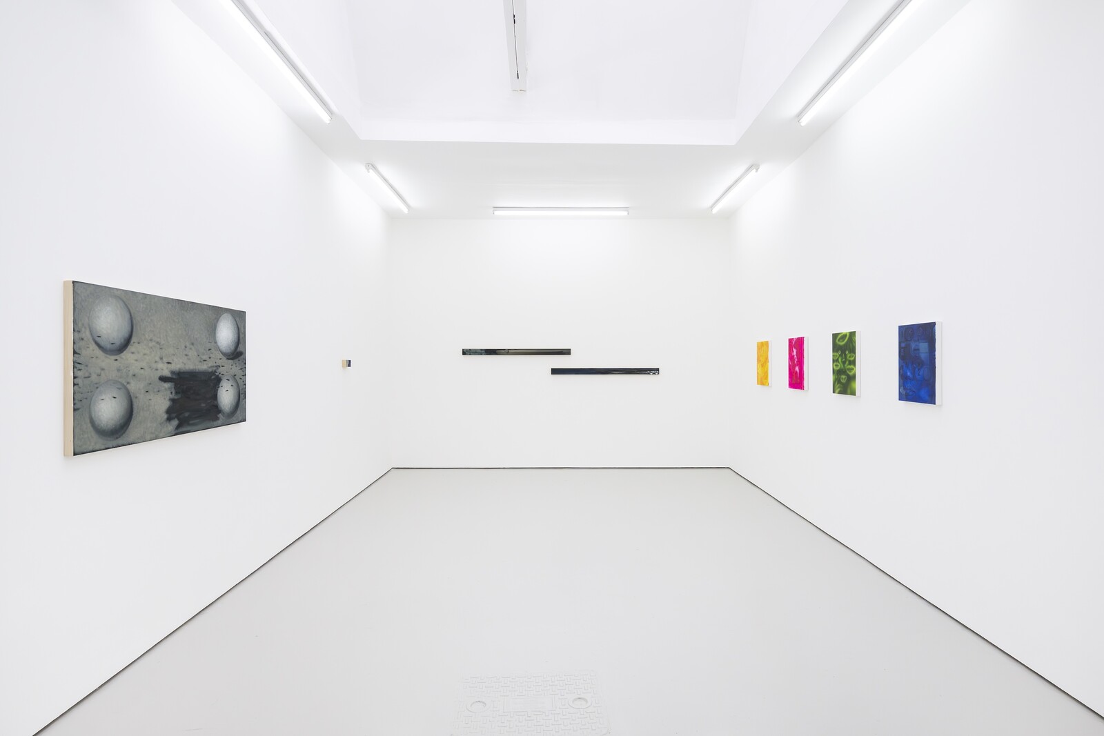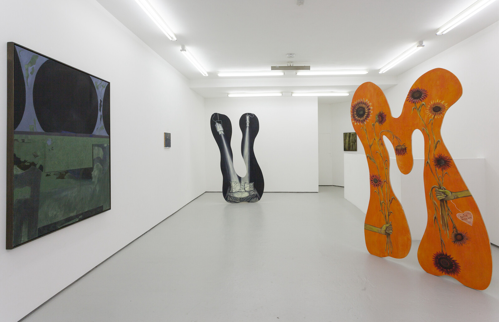 Sans titre, Misako & Rosen from Tokyo, and Union Pacific conceived of this presentation as a group show, titled “Picture a Vacuum” after a poem by Kae Tempest. It includes paintings by Danish artist Martin Aagaard Hansen that are made of oil and pastel but feel like they are composed of earth or another organic matter, and tender small landscape paintings by Kazuyuki Takezaki. Nis-Hansen also shows two small paintings of herself performing, wearing an outfit composed of leaves and reading poetry (she also performed during the opening weekend of Condo, and the speaker and microphone she used were left in the middle of the space).