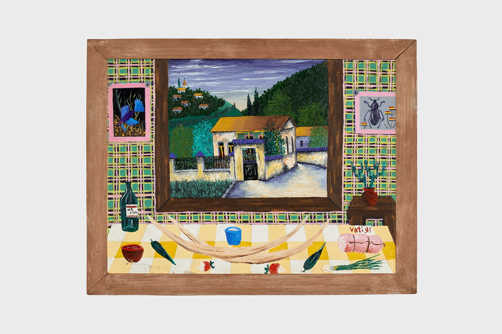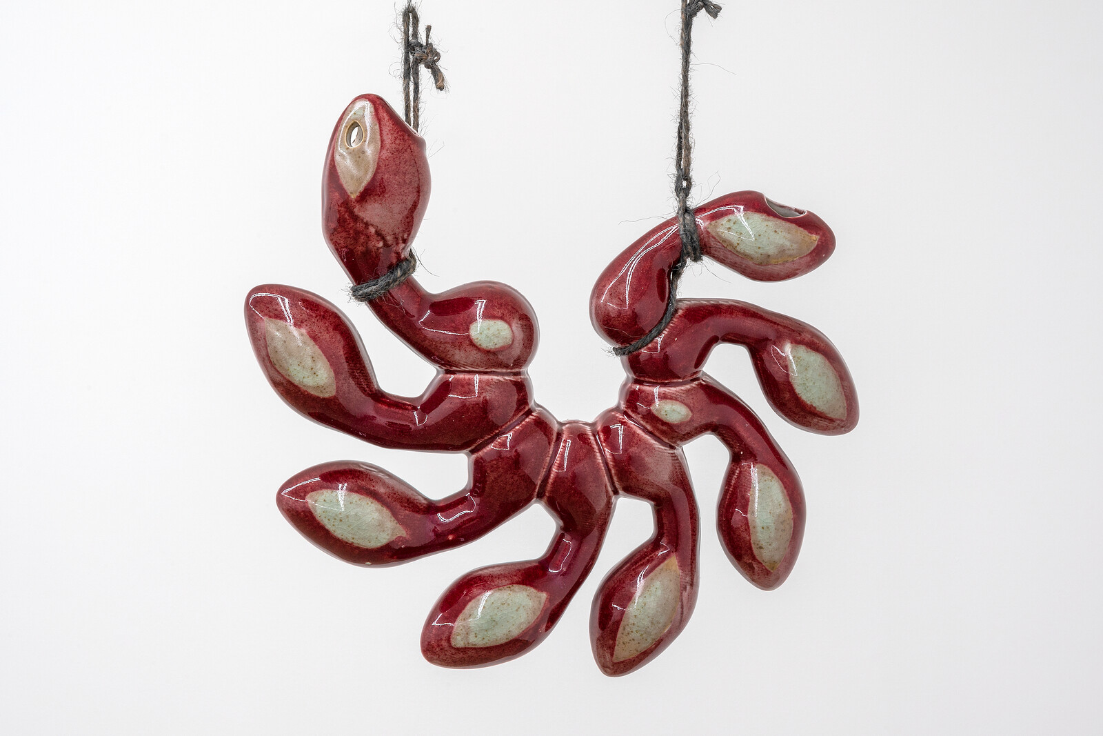The structure of Condo—the travel, the shared spaces—results in a lot of small paintings on view. I loved paintings from New York and Brussels (where Ka is based), as well as Tbilisi (Vati Davitashvili’s paintings of dinner tables and open windows brought by LC Queisser, hosted at Hollybush Gardens) and Tokyo (Emi Otaguro painting on mini tissue packets as part of a group show by KAYOKOYUKI at Sadie Coles HQ). This is complemented by small sculptures whose materiality is imbued with meaning. Peana from Mexico City (hosted at Public) are showing ceramic water flutes made by musician and artist Vica Pacheco using 3D modelling to design these amorphous instruments, traditional in the Indigenous community she is from near Oaxaca. In the space, the flutes hang from strings at chest level, almost touchable but very fragile (if you wanted to see them touched there’s a video on view showing how Pacheco plays them). At Hot Wheels, Maria Toumazou’s sculpture Untitled (Koula’s idea) (2024) is typical of the Cypriot artist’s process, in which found materials lead her to learn a skill like glass blowing or rewiring a violin, the material transformed through story and process.
