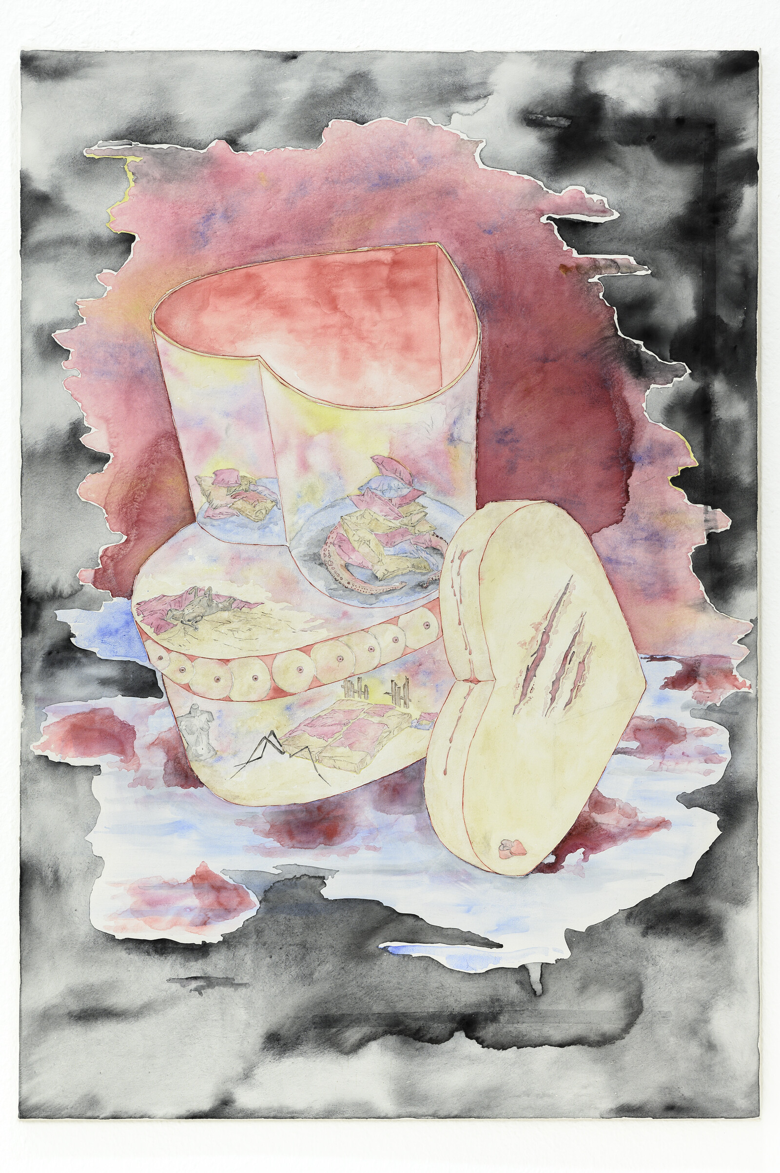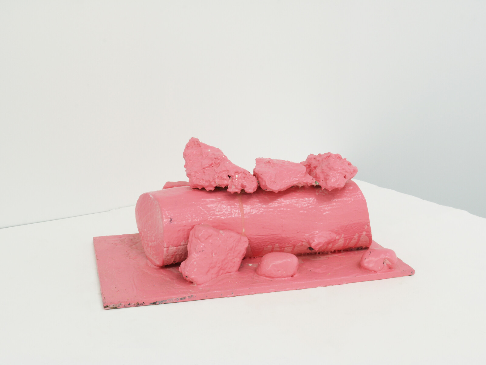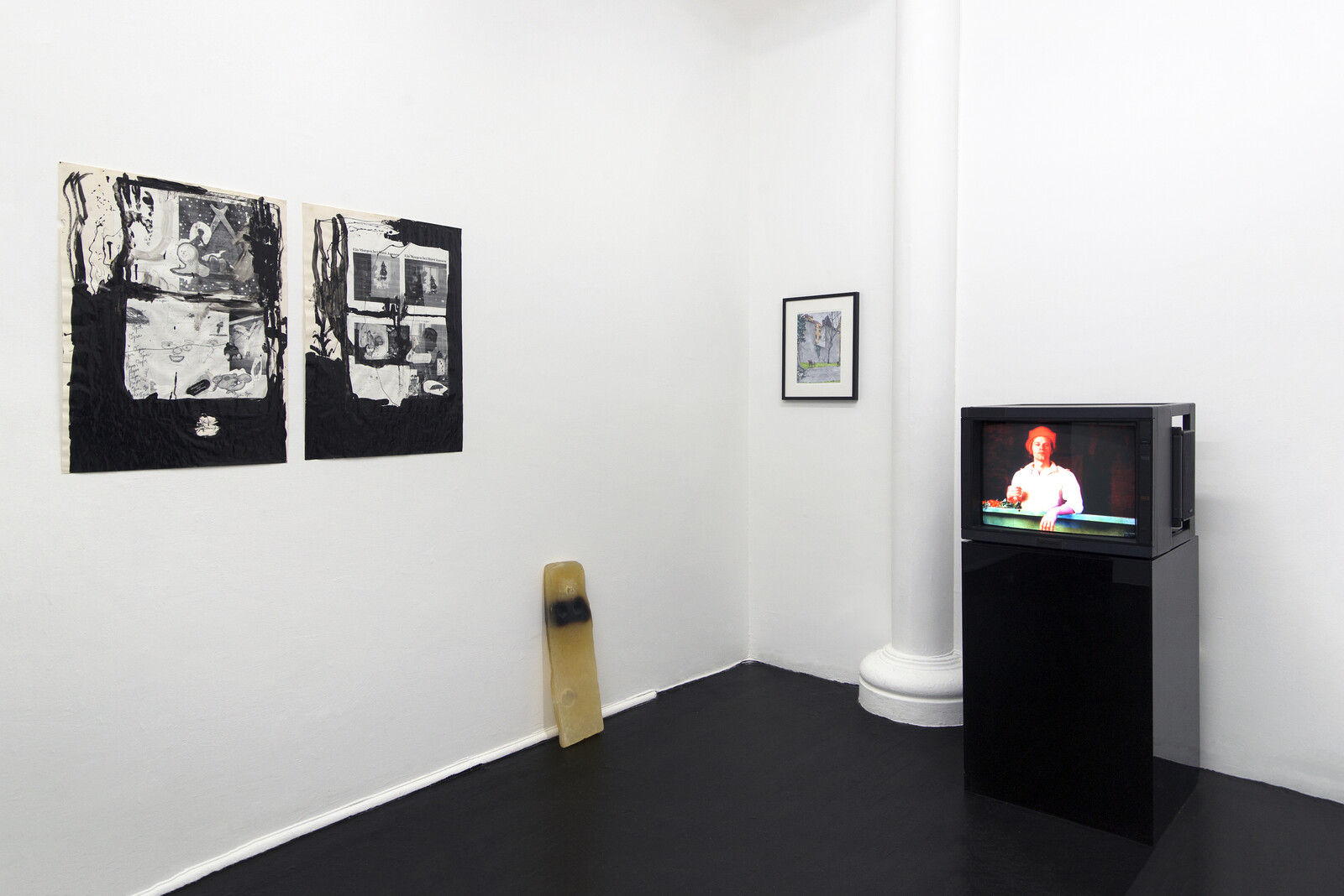 Several exhibitions cohere as group shows. At Queer Thoughts, hosting dépendance from Brussels, an aquarelle on canvas by Sofia Duchovny, Heart Shaped Box (ripped) (2019), makes this 1990s object into the subject of a sorrowful narrative. Next to it is an acrylic on paper of a bird (Toucan, 2019) by Genoveva Filipovic and an untitled drawing by Peter Wächtler (2018) of a figure on horseback going through a dark wood. The three works are not fully representative of these artists’ practices, yet together feel like a lucid group show of contemporary drawing. (There’s also a monitor with a funny short film, Mayonnaise Number 1 [1973], by Charles Atlas of a model pretending to be in a Renaissance portrait only he eats the fruit, breaks the pose, ruins all illusion.) Lomex—named after an urban planning proposal by Robert Moses, the man who imagined New York City as a collection of highways, called Lower Manhattan Expressway, which luckily was never realized because it would have razed much of the Bowery area in favor of a road—hosts O-Town House from Los Angeles, exhibiting little drawings by Gerry Bibby (Note to Self 1, 2, and 3, 2019) printing tiny poems and scribbling notes on found envelopes. They’re framed like family photos and placed on the mantelpiece of the gallery that kept its apartment layout (which used to be Eva Hesse’s studio), a small gesture that allows viewers to stop and read before looking at louder work like John Boskovich’s framed pink bumper stickers reading messages like Screw Guilt and Reality: What A Concept (both 1997).