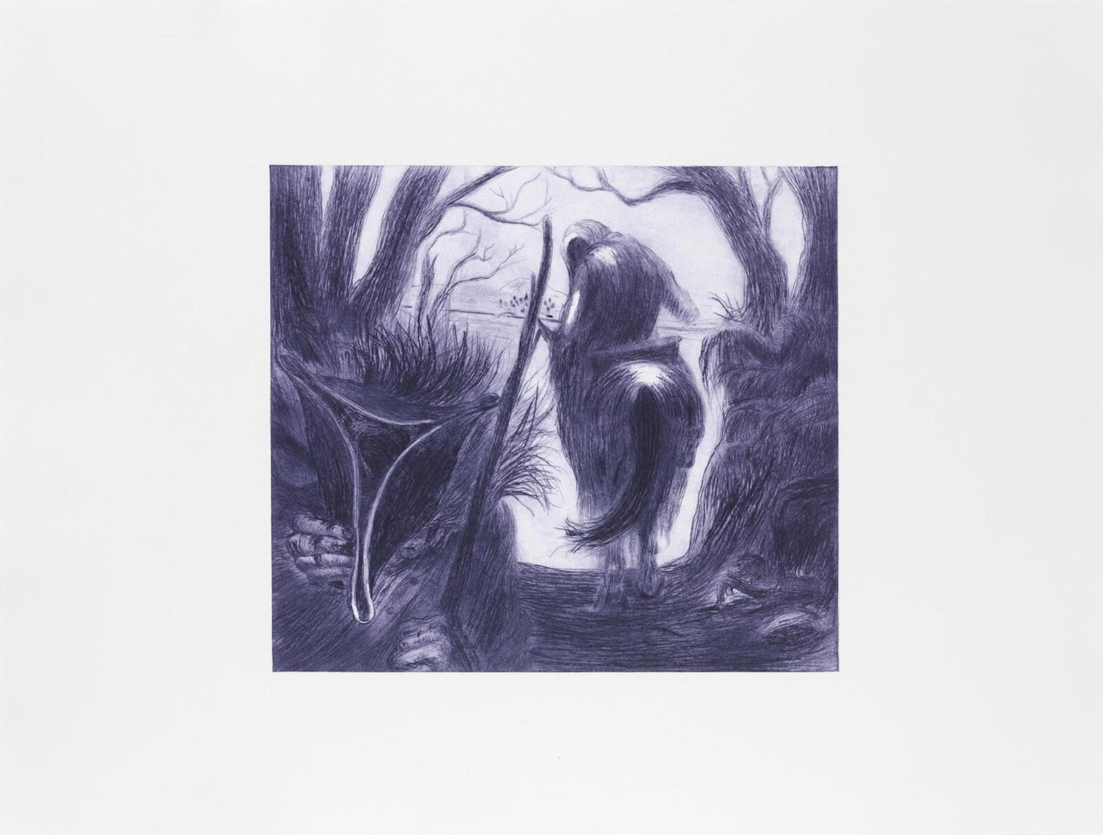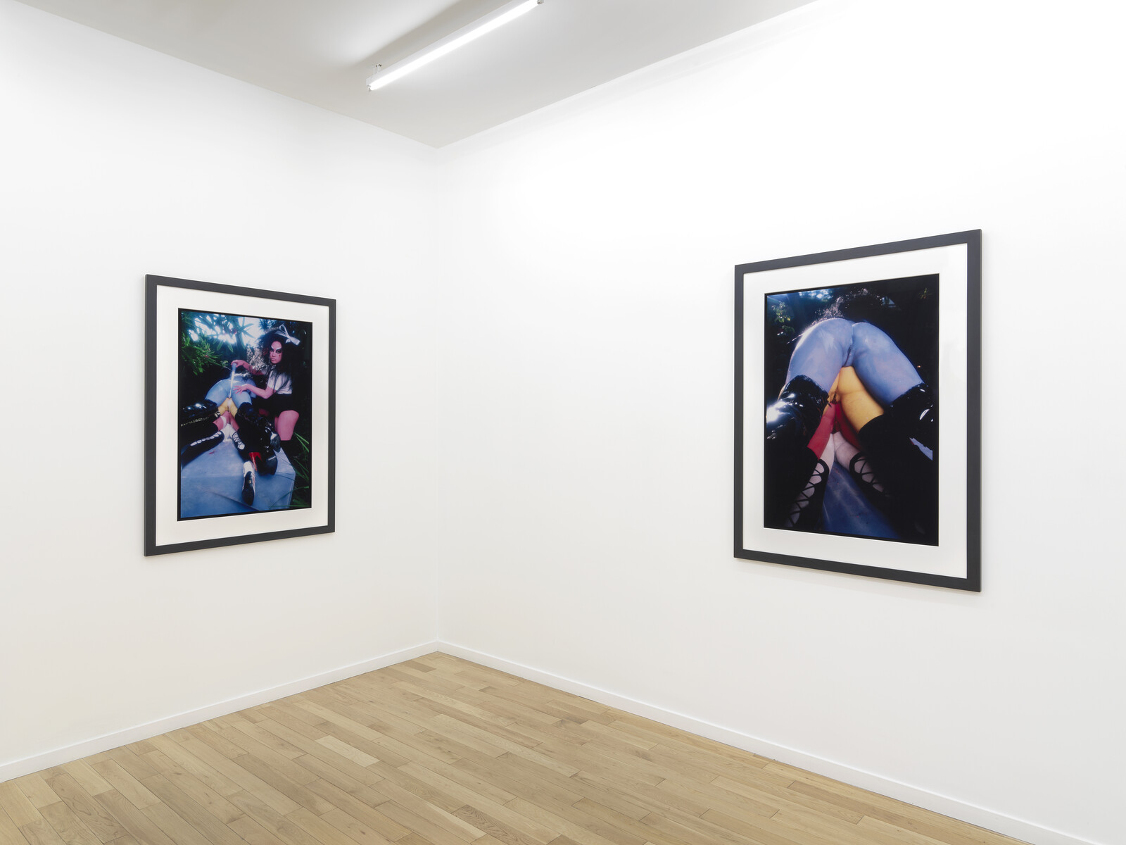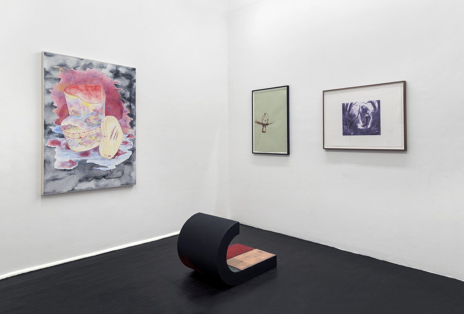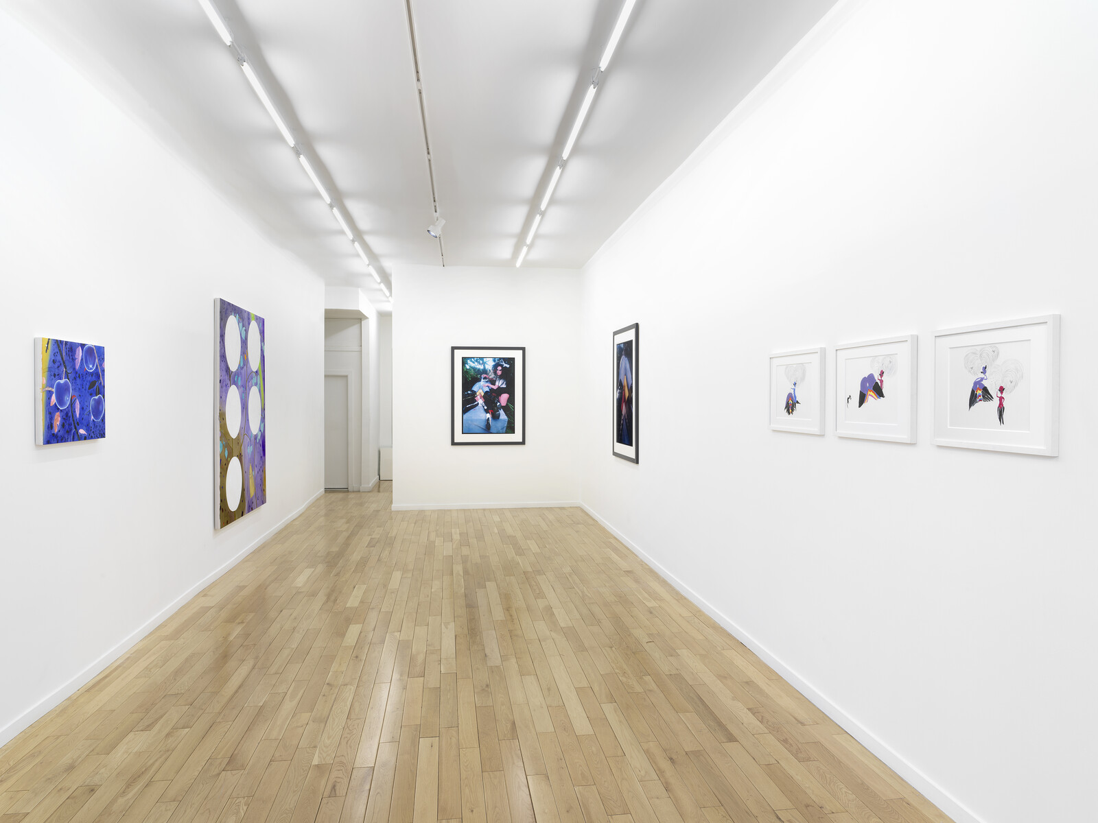 Chance meetings happen across Condo. At Company, two artists who graduated a year apart from Yale with MFAs in photography are showing in the gallery’s two spaces. At the main gallery on the Lower East Side, photographs by John Edmonds merge portraits with West African sculptures; Two Spirits (2019), in which a bare-chested man wears an African mask, feels like a re-appropriation of Pablo Picasso’s Les Demoiselles d’Avignon (1907) in MoMA’s collection. Around the corner at Baby Company, Commonwealth and Council from LA present David Alekhuogie, whose photographs repurpose flags to pay tribute to African-American quilting. Chapter NY hosts London gallery Emalin: two paintings by Paul Heyer, Summer Fruit and Broom Tree (2019), in shades of blue and purple that are much darker than the titles suggest, hang by two photographs from Bruce LaBruce and Kembra Pfahler (Wall of Vagina I and II, 2004/18) drawn from a photo of three stacked naked bottoms that Pfahler remembered seeing in a porn mag, and three drawings by Pfahler (Wall of Vagina Study I, II, and III, 2019) made for the show in pen, acrylic, and glitter. The works come together formally, in their purple and black colors, and conceptually, in the fact that this departure from what a regular visitor to Chapter NY would usually expect from the gallery’s program is still presented in a restrained exhibition of only seven two-dimensional works.