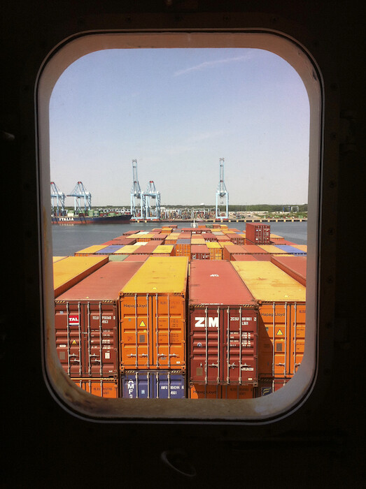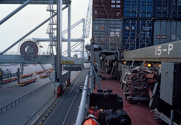 In August 2016, as global logistics firms slumped toward overcapacity, South Korean shipping giant Hanjin went conspicuously belly up. Over 80 of their cargo ships were suddenly turned away from ports around the world, while hundreds of multinational crew faced the further problem of securing either safe repatriation or another job. It was disaster for Hanjin, but a lucky break for Vancouver’s Access Gallery: among the sailors on a Hanjin carrier drifting beyond Tokyo was an artist, Rebecca Moss, whose “Twenty-Three Days at Sea” travelling artist residency stretched to a tense twenty-five. Suddenly, the obscure transit over distant ocean—what Allan Sekula calls the “forgotten space”—was making headlines in a way that an art project rarely does.