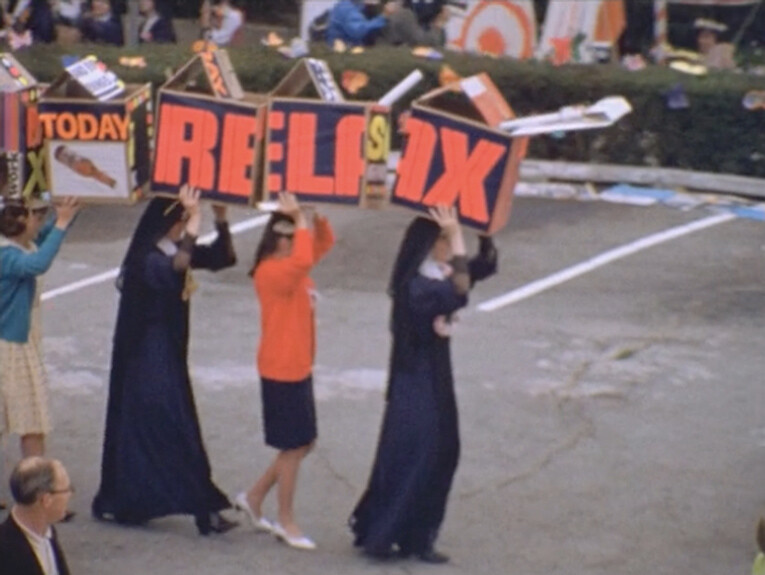 Two rarely seen, recently digitized 16mm films shown at opposite ends of the gallery further elucidate Kent’s spiritual, educational, and artistic philosophies. Shown on a plasma screen, Baylis Glascock’s two-channel Mary’s Day 1965 (1965) features documentary footage of nuns and students at Los Angeles’s Immaculate Heart College celebrating Mary’s Day. Under Kent’s artistic direction (she became chair of the school’s art department in 1964) an austere march commemorating the Assumption became a vibrant rally for peace and an end to world hunger. Women wearing colorful shift dresses, cat eye glasses, and flower wreaths proceed with handmade posters and floats while Kent provides a non-diegetic voiceover. Beginning with a quote by Friedrich Nietzsche, her monologue—more philosophical than religious—emphasizes community activism.