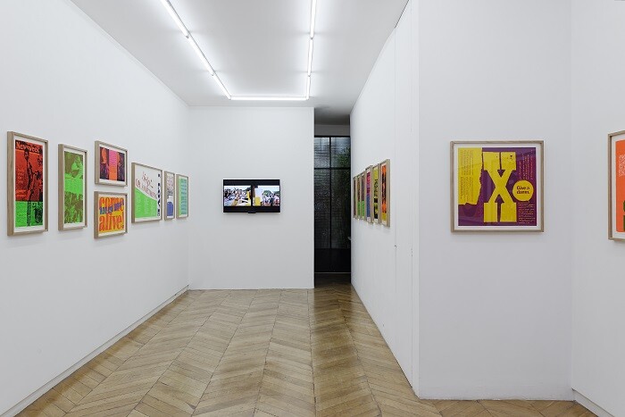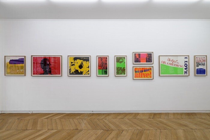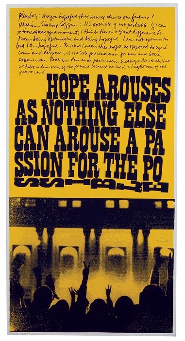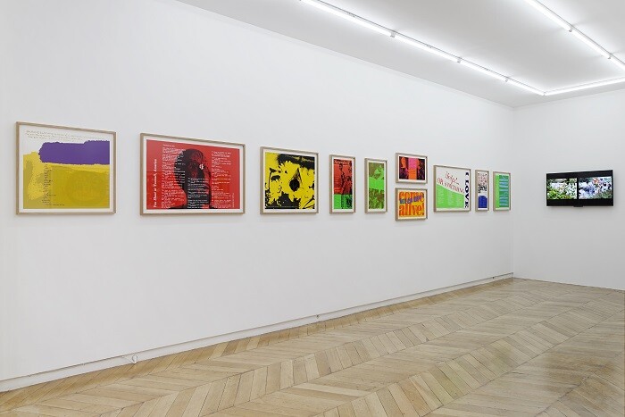 Not far from Place de la République, where a shrine of flowers, candles, posters, and photos honors victims of the attacks, the gallery’s street-facing window offers a taste of Kent’s Pop aesthetic and pacifist ethos. Painted in bright pink block letters directly onto the glass, the proclamation “Hope arouses as nothing else can arouse a passion for the possible” is an excerpt from Kent’s 1969 print a passion for the possible. Showing her flair for mixing text and images from diverse—sometimes seemingly antithetical—sources, this black and yellow silkscreen pairs a quote from clergyman and peace activist William Sloane Coffin with a silhouetted photo of protesters making peace signs with their raised hands.