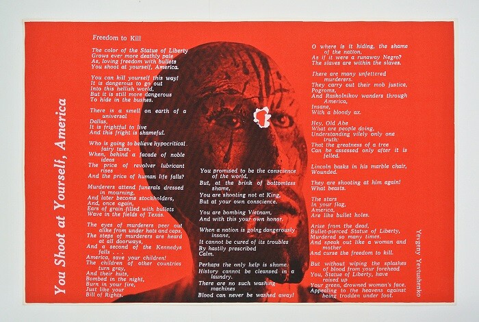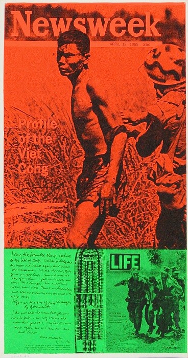 In a pair of related works, Moonflowers and Manflowers (both 1969), Kent uses two different high contrast yellow and purple images to illustrate the same text: the slogan “MAN POWER!” and the title lyric of Pete Seeger’s pacifist anthem, “Where have all the flowers gone?” With its cropped photo of the moon’s cratered surface, Moonflowers evokes the Space Race and Cold War anxiety. Meanwhile, an image of injured US soldiers in Vietnam makes Manflowers one of Kent’s most poignant antiwar posters. In different ways, both works undermine typically positive connotations of manpower, reminding us that man’s power is destructive as much as constructive.