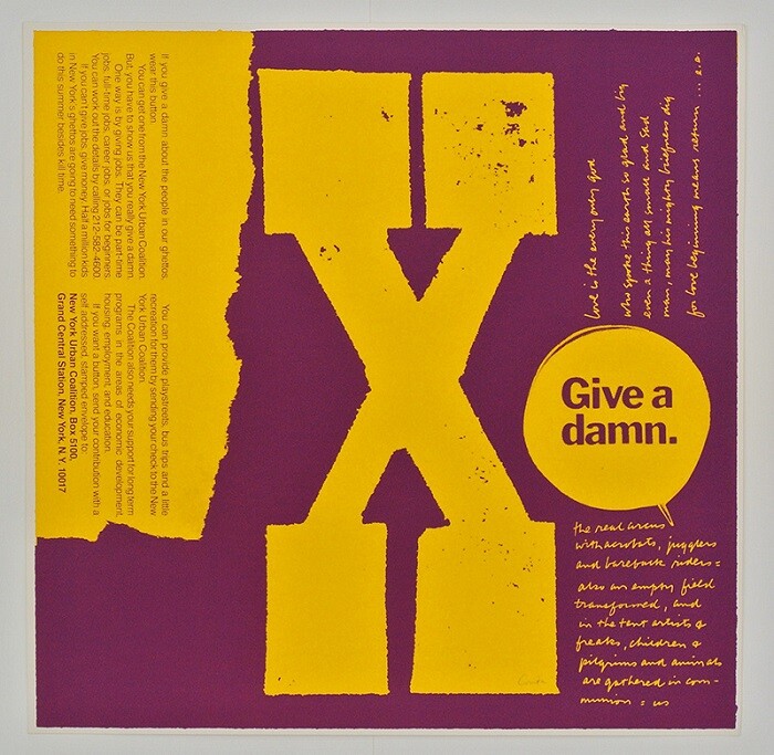 In other broadsheet-sized prints on view, Kent cleverly commingles references from the Catholic Church, advertisements, newspaper headlines, and pop music to create political messages that are accessible and inspiring. But while her rhetoric might ring true today, her aesthetic is rooted in another place and time. Taking visual cues from psychedelic concert flyers, California surf culture, and contemporary artists like Andy Warhol and Robert Indiana, Kent’s late 1960s prints are characterized by DayGlo colors, collaged news photos, and a pre-punk mix of stenciled and handwritten text.