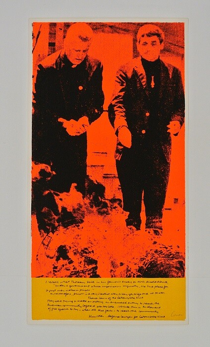 One of several prints from Kent’s 1969 “Heroes and Sheroes” series, phil and dan pairs a blood red image of two priests standing above a bonfire with two handwritten quotations. One of the quotes is attributed to William Kunstler, the civil rights lawyer known for defending radical groups including the Black Panthers and the Weather Underground: “They were trying to make an outcry, an anguished outcry to reach the American community before it was too late. I think this is an element of free speech to try—when all else fails—to reach the community.” Kunstler also represented Philip and Daniel Berrigan (the two men pictured) as part of the so-called “Catsonville Nine” group of Catholic political activists convicted in 1968 for burning draft records with napalm. Kent’s most iconic heroes are even more tragic—among them President John F. Kennedy, Senator Robert F. Kennedy, and Dr. Martin Luther King Jr. Memorialized in magenta and green in Love your brother, King appears in two photographs: with his wife on the day he was awarded the Nobel Peace Prize and in a police car, under arrest. Across these paradoxical portraits Kent has written, “The king is dead. Love your brother.”