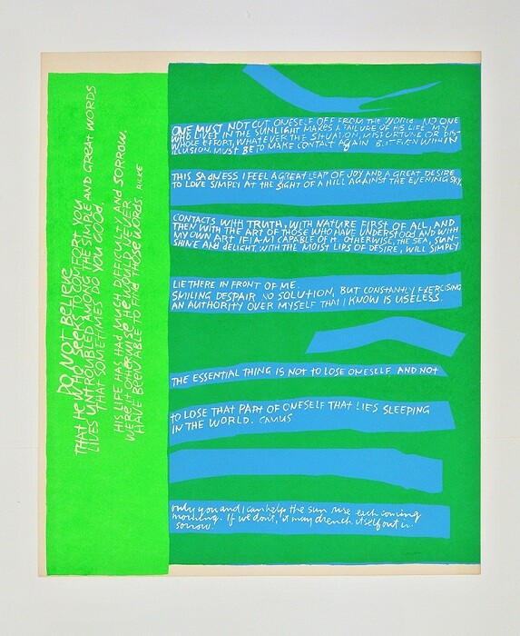 In difficult times, we look to the past for comfort and clarity. In the wake of France’s deadliest attacks since World War II, Corita Kent’s late 1960s and early 1970s silkscreens promoting pacifism and tolerance take on an unexpected urgency. Planned well before terrorists killed 130 Parisians, Galerie Allen’s exhibition devoted to the late American artist, activist, educator, and former Catholic nun,1 now feels eerily prescient.