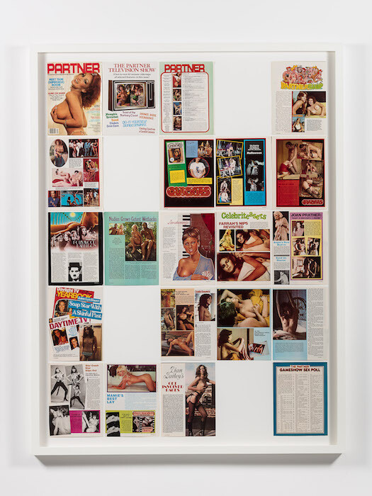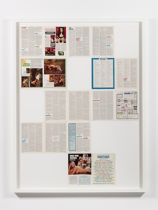 Could Cosey’s interest in penetrating these different spaces be seen as a form of political or feminist activism, enacted by going undercover in the sex industry? Or a pleasure-seeking curiosity to penetrate what morality has rendered taboo—as sexual performance, as music, as art? Her recent autobiography (Art Sex Music, 2017) offers candid insights into how she perceives no boundaries between her lived experience and artistic practice. Unaware of this, the visitor might experience in Cosey’s work not so much a merging of life and art as a reminder of the sharp lines of morality separating what constitutes pornography from culture’s accepted images. If her work urges dialogue across this line, it makes it no easier to navigate, as we move from the stark elegance of Szabo’s full frontal photographs to the centerfolds of Partner and, finally, to her recent film, screening in the basement.