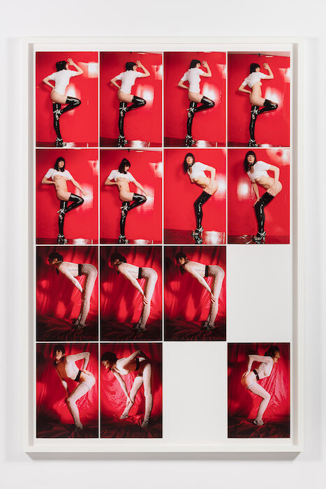 Szabo’s photographs raise again the uncomfortable questions that Cosey has posed about women artists’ agency to perform and spectacularize their own bodies and their own desire, particularly when that agency touches upon female power as a form of monetary exchange. But Cosey exceeds the neat lineage which a feminist discourse might trace from Hanne Wilke’s S.O.S Starification Object Series photographs (1974-82) or Carolee Schneemann’s Interior Scroll (1975) to the riot grrrl abandonments of Pipilotti Rist or Tracey Emin’s confessional video Why I Never Became A Dancer (1995). Those works signal a critical deployment of the body within the context of art, addressing their audience with anger, entreaty, even shame. By contrast, Cosey crosses over into pornography. In Szabo’s glossy photographs she looks into his camera with a stark and insolent gaze. Yes, her directness could be read as a feminist recalibration of the peekaboo provocations of conventional glamor photography, but there is also the suggestion that she is doing this for pleasure, not under sufferance.