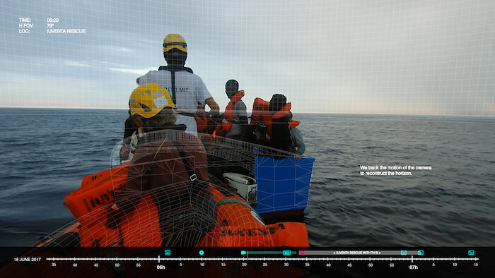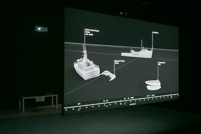 The practice of “counter-forensics” relies on material available in the public domain. Refused access to incident sites, in many of their cases Forensic Architecture analyze satellite images. Architect and academic Laura Kurgan describes the interpretation of such photographs as “an art, as well as a science.”4 The sharp binaries of subjective versus objective, art versus science, blur in the shared language of aesthetics. This intentional murkiness is evident in The European Union’s Lethal Maritime Frontier (2011–ongoing), featuring four investigations into migrant deaths in the Mediterranean over the last 30 years. Dramatically installed in the ICA’s theatre, an indigo monitor screen floats in a sea of black. A glowing white line darts from the Libyan coast, stops, veers back on itself: a scattering of green dots twinkle. This image depicts an overcrowded migrant boat drifting in distress, surrounded by commercial and military vessels, none of which intervene. In using surveillance technologies, Forensic Architecture co-opt “the master’s tools” to capture a crime of neglect.