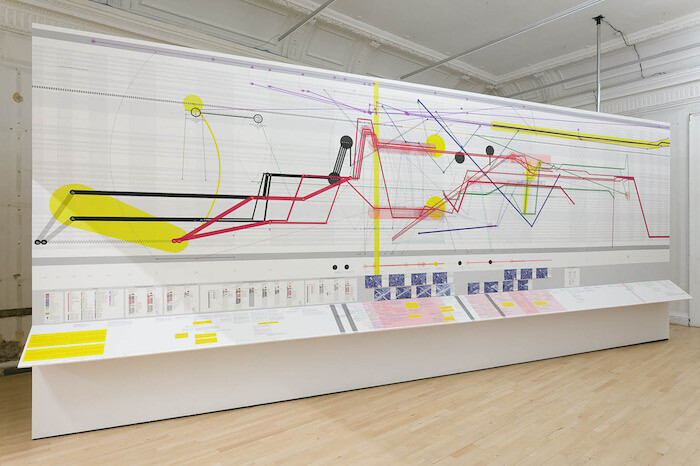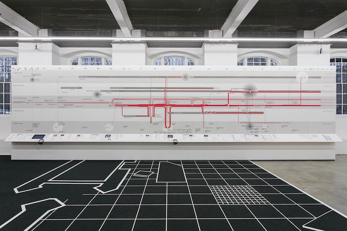 Take the large-scale mural The Forking Paths of Ayotzinapa (2017). This narrative timeline plots the police-enforced disappearance of 43 students in Iguala, Mexico, on September 26–27 2014. Red and black lines spike and diverge, intersecting with yellow beams and circles: a formally confusing and conflicting strata of data. I scan from left to right, then top to bottom, cross-referencing patterns of color with an accompanying key. A wall text explains this graphic juxtaposes the Mexican Federal Attorney General’s account of the event with conflicting ones extracted from survivors’ testimonies. Forensic Architecture describe the Mexican state’s destruction and falsification of evidence as “violence against people, but also violence against information.” Information—and the technologies that capture and store it—is given agency and weaponized. While the dense opacity of these visualizations evidence a failure to communicate clearly, they also suggest something more fundamental: the fallacy of “clear communication” when it comes to forensics.