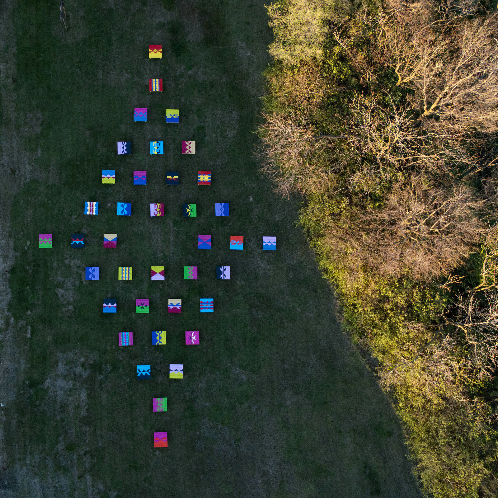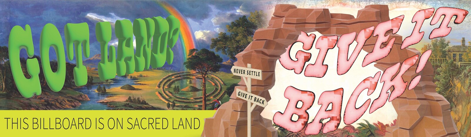 Anna Tsouhlarakis’s billboard The Native Guide Project: STL (all works 2023) overlooks this mound, which is now owned by members of the Osage Nation. It reads: “WHEN YOU LISTEN THE LAND SPEAKS.” On the other side, a billboard by New Red Order, Give it Back: Stage Theory, reads: “Got Land? Give it back!” The phrase was echoed in their related video (which shares the same title) shown at the St. Louis Art Museum, built after burial mounds were razed to make way for the Louisiana Purchase Expedition, or St. Louis World Fair. Held in 1904, this event included a human zoo in which living Indigenous people were displayed, a dehumanizing spectacle staged in the name of science. A nearby field is home to WayBack by Anita and Nokosee Fields: forty wooden platforms that replicate those used by the Osage Nation for naming ceremonies or weddings.