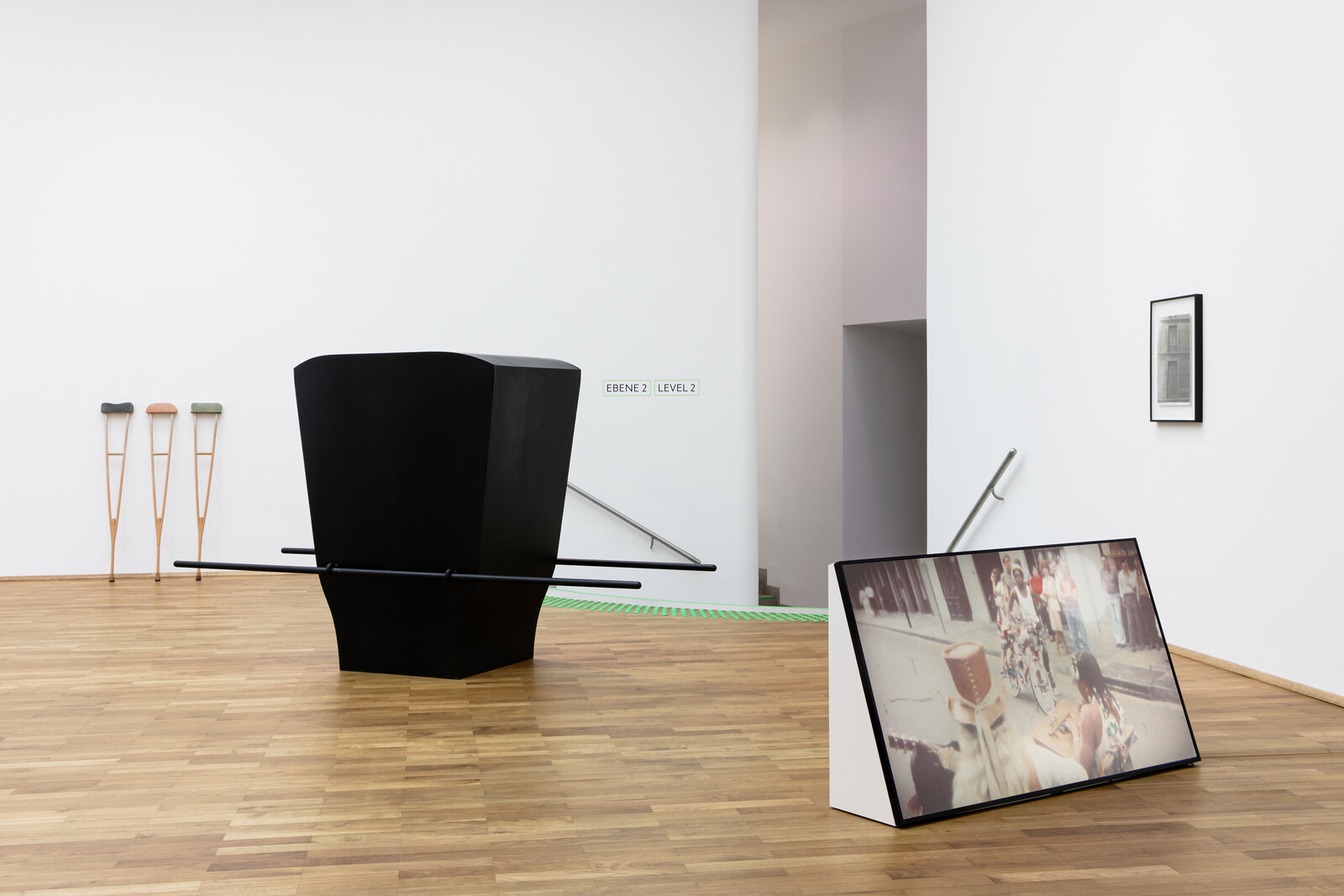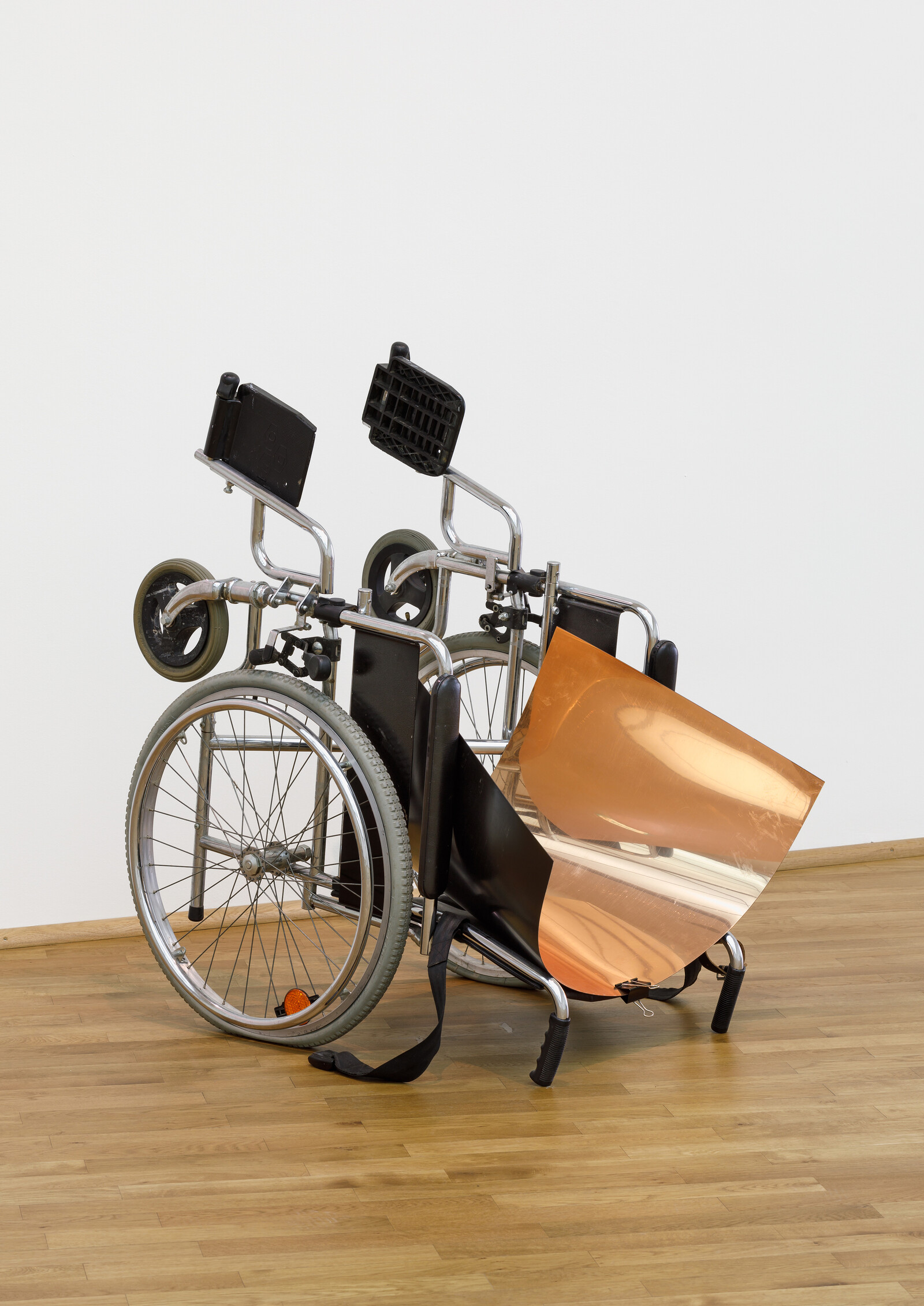 With Isa Genzken’s untitled overturned wheelchair, which positions the chair as a sculptural object removed from what the exhibition guide calls its “drab functionality,” the curation fails to make clear the relationship of the artist with the device. Genzken’s Krankenhausfotos (Hospital Photos) (1991), which document incidental details from the artist’s hospitalization, are included as if to justify the artist’s presence in the exhibit. What do these pieces add to the notion of crip time beyond the medical realm? What is a wheelchair without its user? Those familiar with Julia Watts Belser’s 2016 essay “Vital Wheels: Disability Relationality, and the Queer Animacy of Vibrant Things” or Jo Spence’s cancer photographs will know that more apt inclusions could have been chosen to illuminate and expand the show’s central theme.2