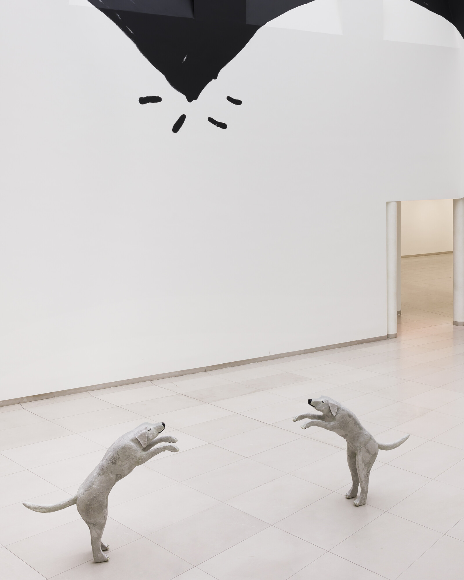 The exhibit starts promisingly in the spacious first-floor atrium with Emilie Louise Gossiaux’s sculpture Dancing with London (2021). The joyful double presentation of Gossiaux’s guide dog London, reinforced in drawings hung in a room nearby, gives an intimate look at the relationship between the artist and her support companion.
