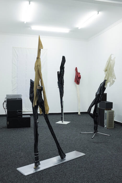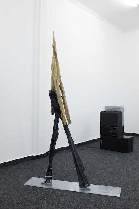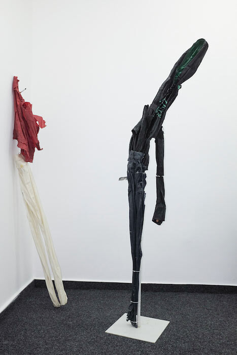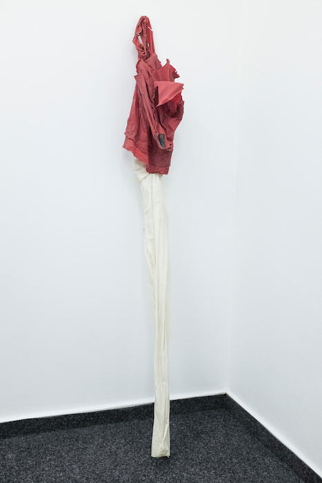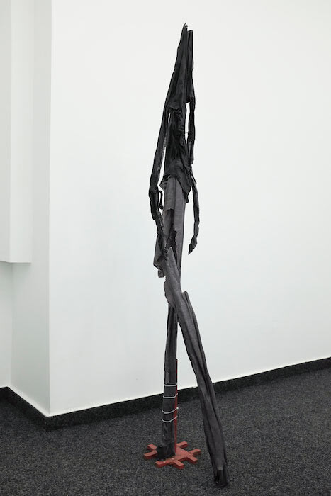 While daily business as we know it goes on outside, inside the gallery (which was previously a bookshop), one encounters what appear to be the remains of a long party that hasn’t really ended. Spichtig’s anthropomorphic figures (all Untitled (Ghost), 2015), like bodies frozen in motion, are made of resin and second-hand clothing. Playing with an iconography of phantoms, their spatial choreography is open to a variety of interpretations.