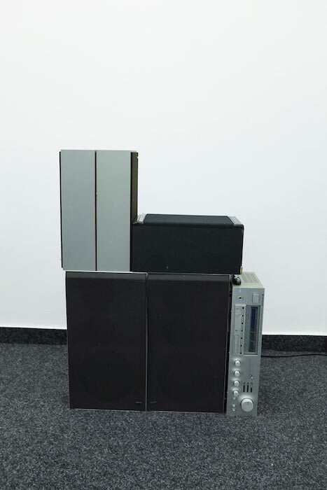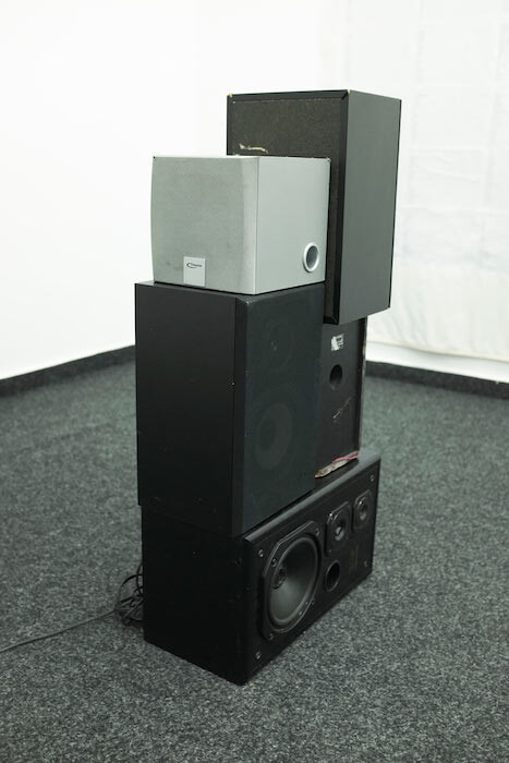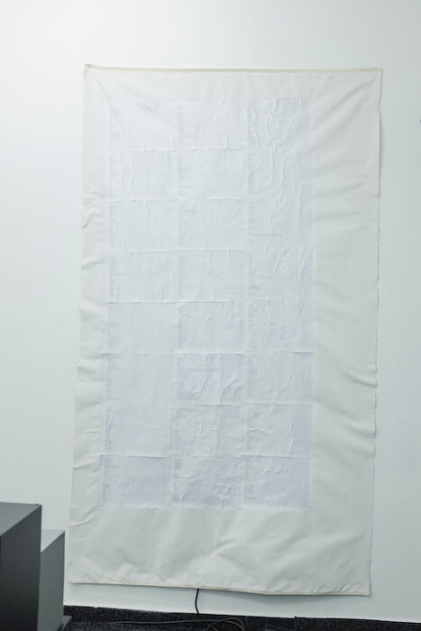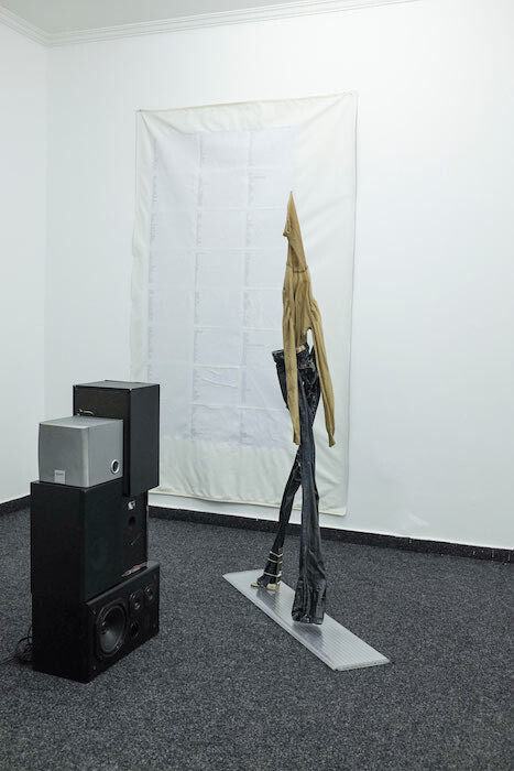 At the same time, Sprichtig and composer Thorsen-Nagel’s collaborative sculpture, titled Ruin the Landscape (2015), assembles various speakers to circulate an edgy soundtrack of uneven sound surfaces. The musical composition works as an inconsistent radio frequency, channeling sound from different sources, constantly interrupting any attempt on the viewer’s part to form any personal or collective attachments to the scene. The surrounding narrative material, provided by Sprichtig—a short, untitled narrative printed on a gallery handout, and Untitled (Guest List) (2015), the gallery’s mailing list (printed onto A4 sheets of paper and abstracted onto a new wall piece made in Pristina)—plays a similar role: their unlikely appearance complicates any assured readings of the ongoing conversations between the ghostly figures and sound sculptures. And most importantly, the composition of the scene engenders a certain democracy of materials—in other words, no hierarchy exists between words, resin, and music.