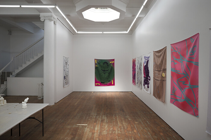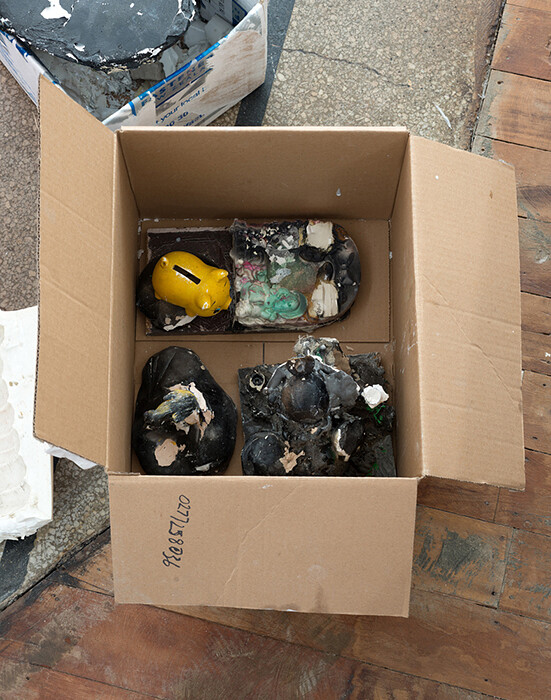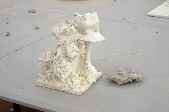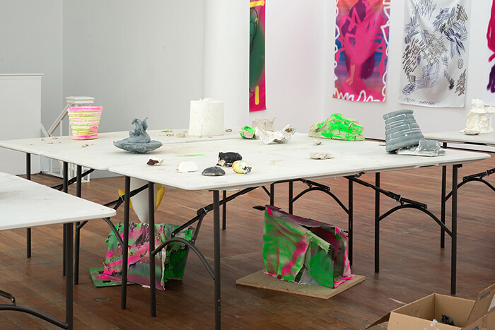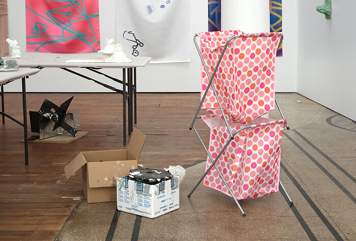 As its title suggests, “Plastic Mouthfeel II,” the latest exhibition from New Zealand artist Dan Arps, is a space full of viscous forms, loaded with colors and textures, that causes a constant sense of elastic deformation. Take, for example, Studio Units with Double Hamper (2015), a set of five white but unclean folding trestle tables, located at the center of the gallery, on top of and around which an uncustomary arrangement of disparate objects and detritus invites careful examination. Spread out on the tables and the surrounding floor—as the landscape of a work in progress, such as those found in art schools—are casts, brightly tinted pots, splashed paint, clay chunks, multicolored Abstract Expressionist sculptures, melted assemblages, boxes, and a pink polka-dot double hamper. Some pieces of the installation are particularly comical, such as a small, white, psychedelic sculpture of a piggy bank on a mushroom, and a readymade with a dragon figure carrying on its back a rolled-up dirty towel. But this thoughtful mess seems not meant for display or public consumption. While trying to scrutinize the content of a carton on the floor, one gets the uncanny sensation of poking around someone’s stuff. Evoking the spirit of a workshop inside a gallery, Arps’s effective meta-space induces a feeling of being simultaneously a wanted art viewer and an unwelcome trespasser, a bipolar effect that is characteristic of the artist’s work.