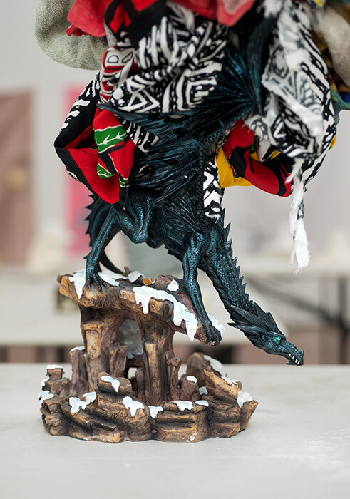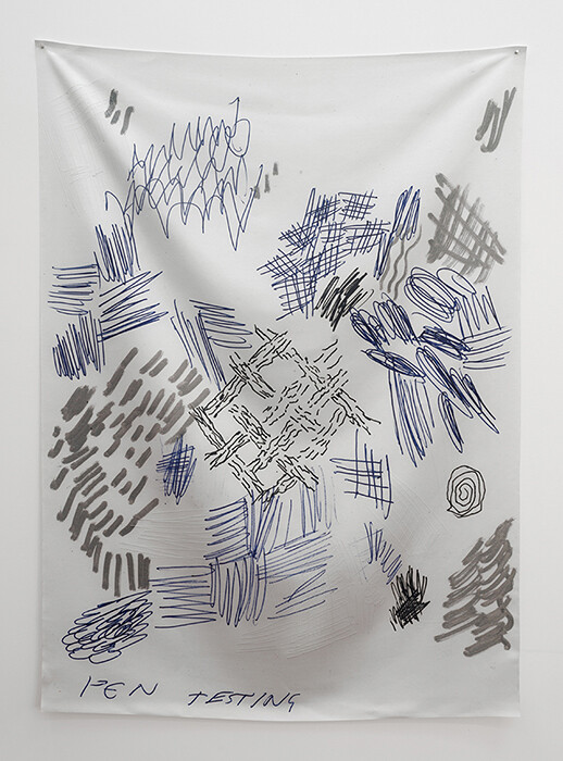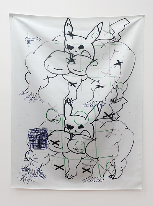 This scenographic arrangement continues with a series of nine multilayered and multicolored dye-sublimation prints on satin—a process commonly used in mass textile production—lining the far walls of the gallery. Personal favorites are Leveled Up (Pikachu) and Pen Testing (both 2015). The former is a print of pen drawings that juxtaposes, on the background, a pair of tic-tac-toe games and studs. In the foreground, a pair of Pikachus ironically show their competitive nature, transforming their cute and infantile anatomies into monstrous faces and ridiculous, super muscular bodies. The latter consists of a series of different pen marks that create a pleasing abstract composition in gray, blue, and black. Both works are simple and effective; they have a sense of casualness that permeates Arps’s work.