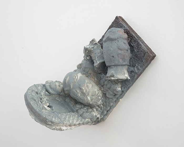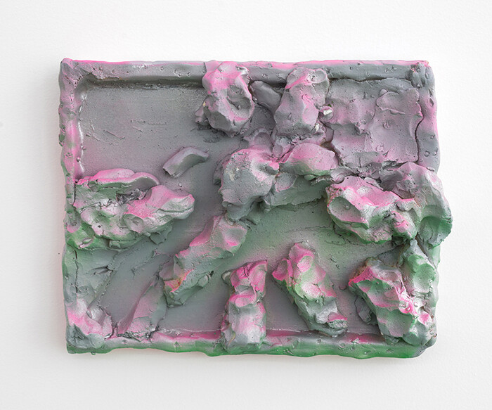 These sensations dissipated somewhat when I noticed works on an adjoining wall, more conventionally arranged for exhibition: three polyurethane-based interstices of sculpture and painting whose seductive textures call to be touched. For instance, Relief Study (Fluro/Primer) (2014) consists of formless reliefs, resembling plasticine squeezed and kneaded. Its gray undercoat, suffused with fluorescent pink, makes the volume of these reliefs even more striking. Arps’s work shows an interest in workplaces and pathologies; perhaps here is another psychological turn, a parallel between art and therapy implied in the title. Aside, thoughtfully installed at a 45-degree angle, is Untitled (Primer Series) (2014), another transformation of mundane, infantile objects into intriguing, polysemous, and indecipherable matter, which, depending on the position of the viewer, could resemble a pot fountain or a tomb. In the corner is Lump (Silver/Fluro) (2014), a melted clump protruding through the bottom of a flat, rectangular surface painted in silver and with toxic fluorescent green tinges.