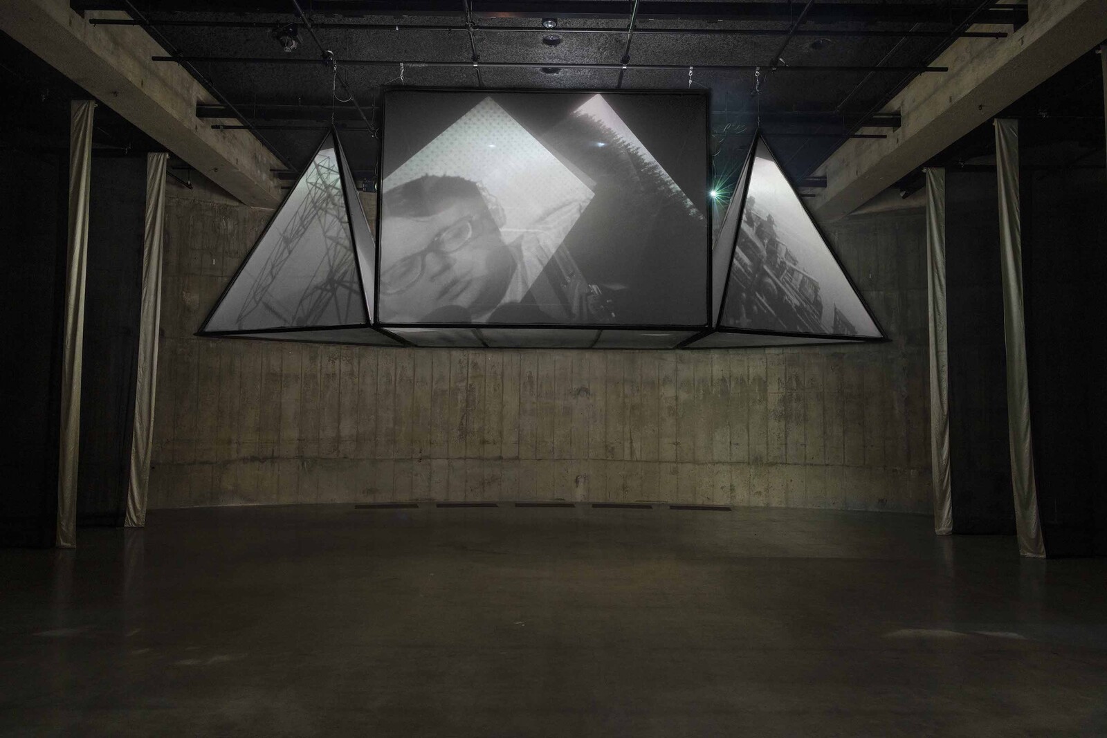 Space was essential to Set and Reset’s production; Brown described it as exploring “relationships between figures both plastic and organic, about space, both physical and aural.”2 Rauschenberg designed its set and costumes, fashioning an interlinked pyramidal and cuboid framework that was covered with a reflective fabric developed by NASA, and elevated as an on-stage projection screen. He considered it a sculpture, and named it Elastic Carrier (Shiner) (1983). Onto it were projected his montages of excerpted news reportage, television shows, and NASA footage. For the dancers’ costumes, he silk-screened black-and-white images of New York City onto white gossamer fabric.