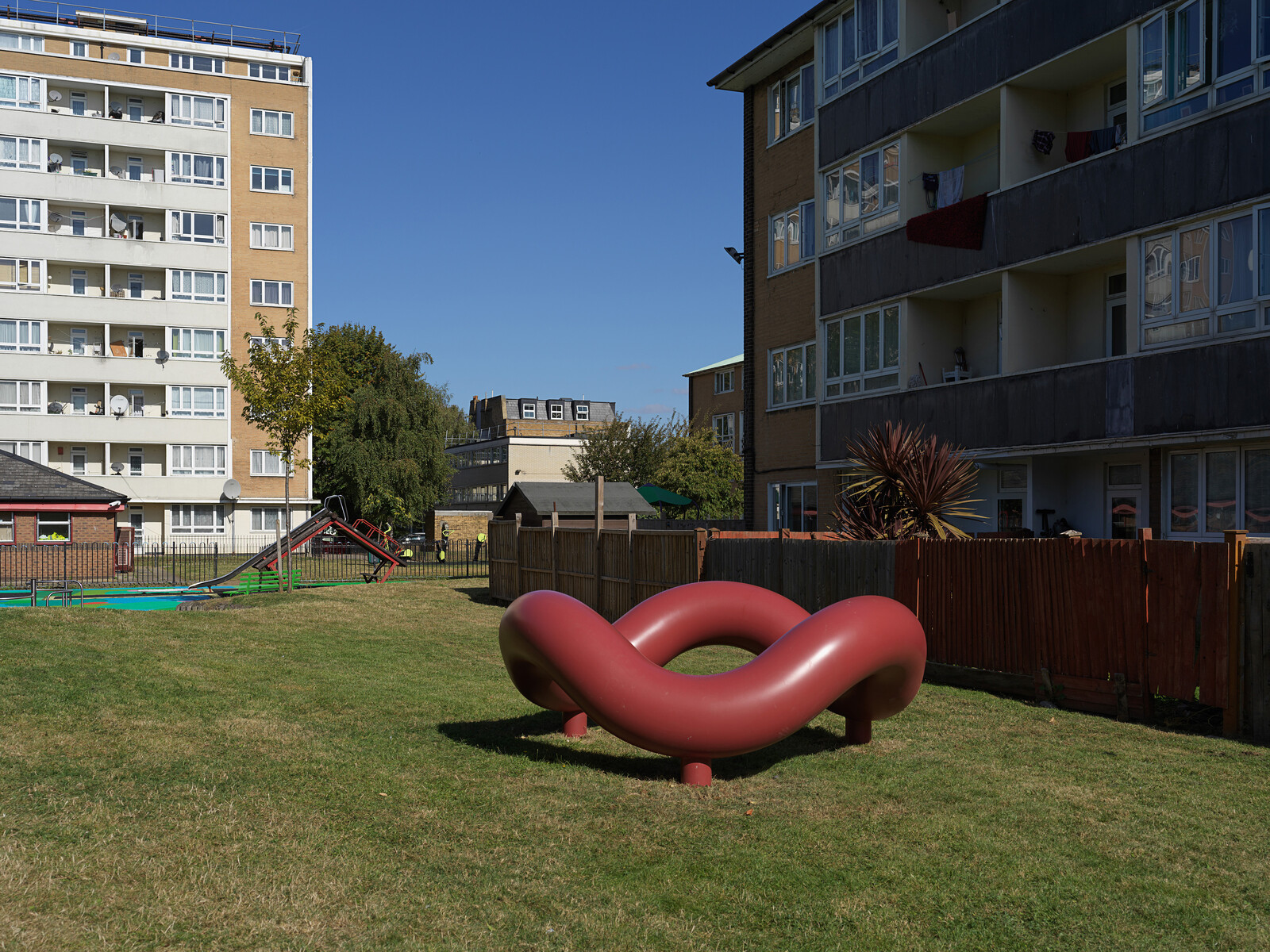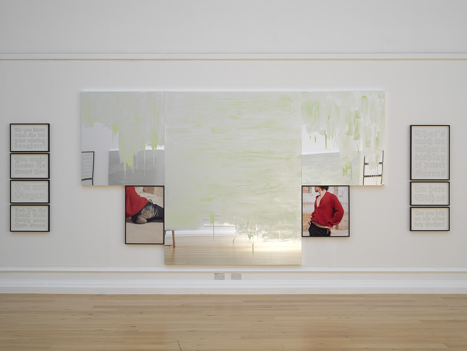 Vo’s solo exhibition at South London Gallery is a paean to such ontological symbiosis and, appropriately, is no solo exhibition at all. Of the works included in “untitled,” which occupies the institution’s two spaces, few are credited to the artist alone: Photographic portraits by Vo’s partner, Heinz Peter Knes; calligraphy by his father, Phung Vo; large-scale mirror paintings by Vo’s former teacher, Peter Bonde; and works from the likes of Felix Gonzalez-Torres and Nancy Spero selected in partnership with artist and Group Material cofounder Julie Ault. In an adjacent public housing project, Vo has installed Isamu Noguchi’s Play Sculpture (1975–76), an undulating loop of red tubing upon which local children are invited to climb. It is a gesture that, like the exhibition more broadly, is at once simple and emblematic of Vo’s understanding of the world: that which comes before informs that which is yet to come.