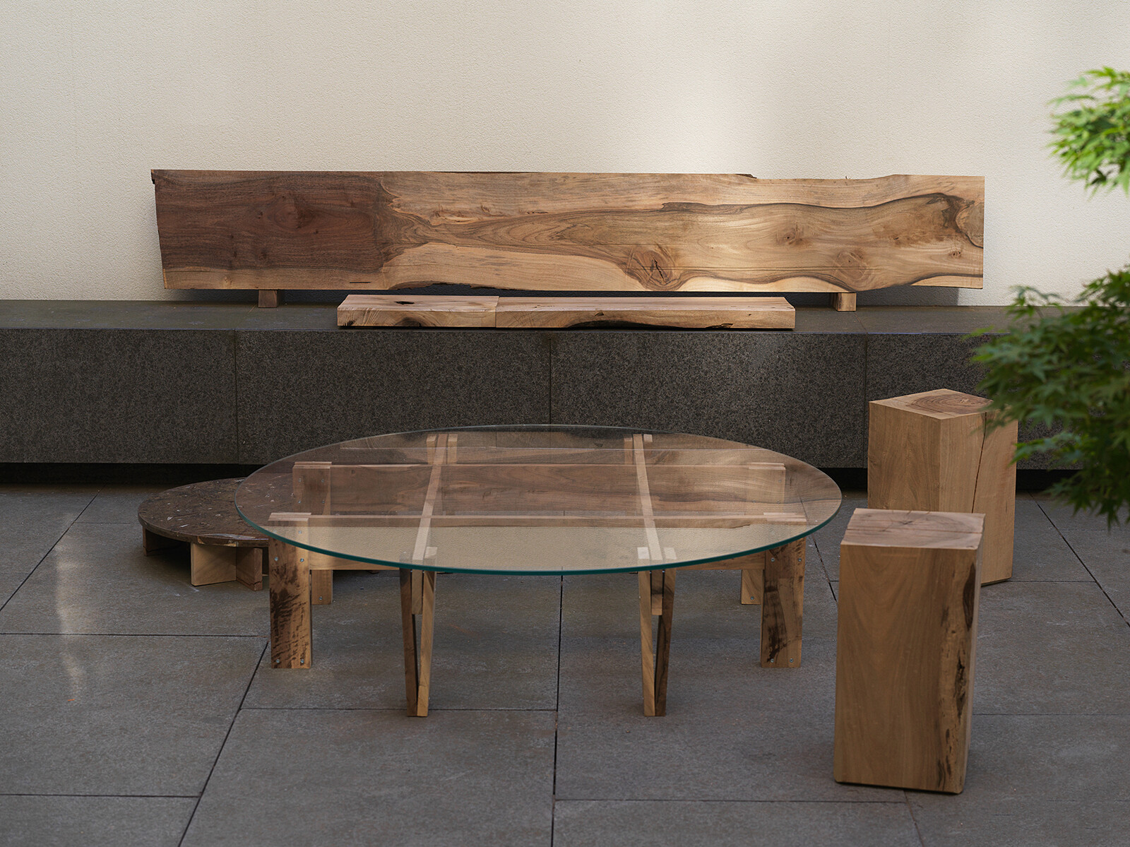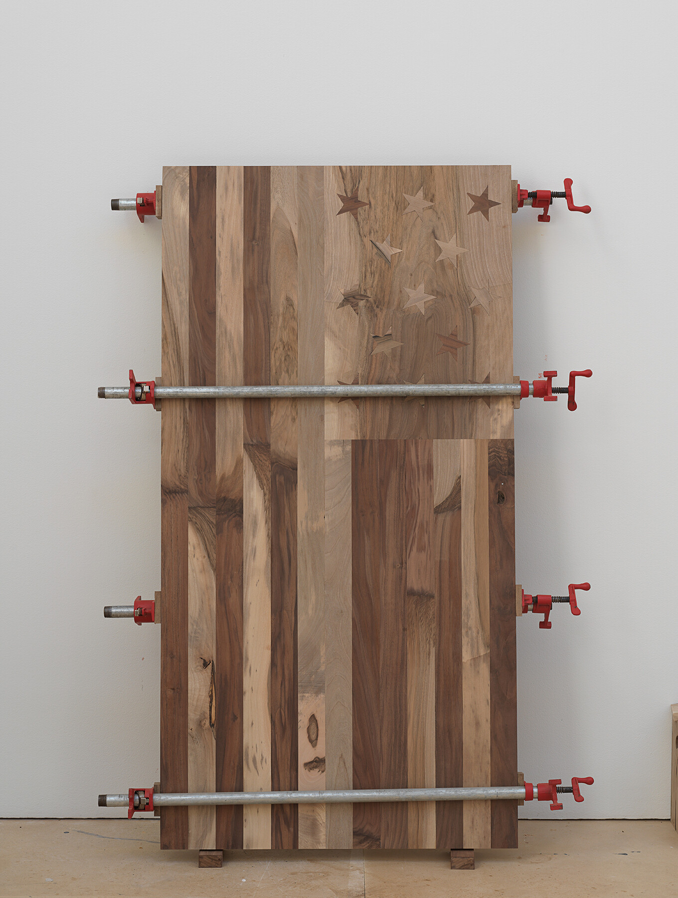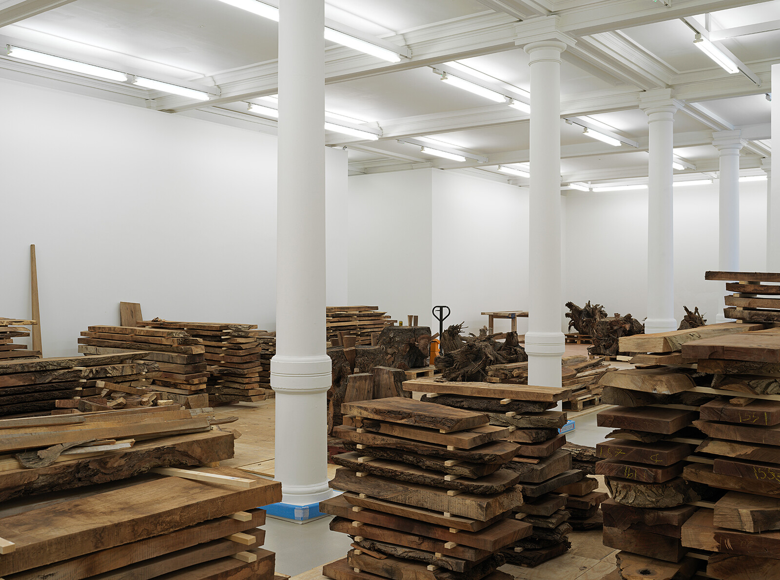 In 1980, Craig acquired a diversified farming enterprise in California called Sierra Orchards and, in the process, inherited a crop of maturing black walnuts—trees that, due to their size, strength, and uniform grain, are used to produce gunstocks. On the ground floor of Marian Goodman, Vo has assembled a lumberyard of this timber, which was transported in the form of stacked planks, beams, and hulking boles. On the second floor is a workshop in which, for the show’s duration, carpenters will convert the lumber into a range of furniture and objects inspired by twentieth-century designers. This furniture is delicate, simple, expertly crafted. Most salient, however, is the manner in which the (physical/symbolic) heft of the below floor is so dramatically reduced, refined, negated. Circling these products, we become acutely aware of their former states, their secret lives, the things they were and, in a sense, still are, but no longer appear to be.