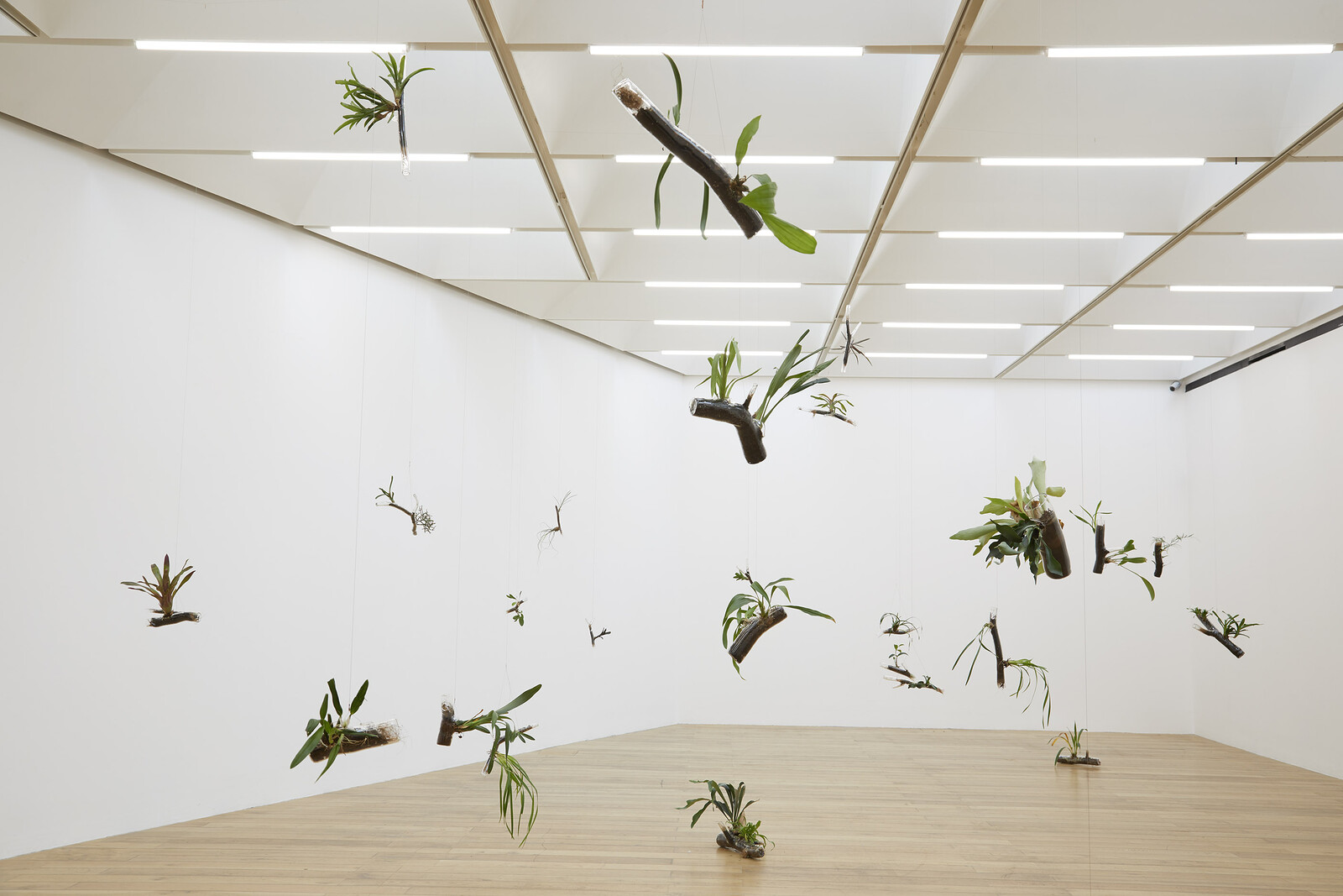 A new commission, Living Thoughts (2019), brings the biodiversity of the Atlantic Forest into a brightly lit white cube. This rainforest, which stretches along the Atlantic coast of Brazil and into parts of Paraguay, Uruguay, and Argentina, is home to some 23,000 species of plants and more than 2,000 species of animals. But with only 7 percent of its original extent preserved, it has become Brazil’s most endangered ecosystem. São Paulo and Rio de Janeiro, two of the world’s largest cities, were built over areas of the forest.1
