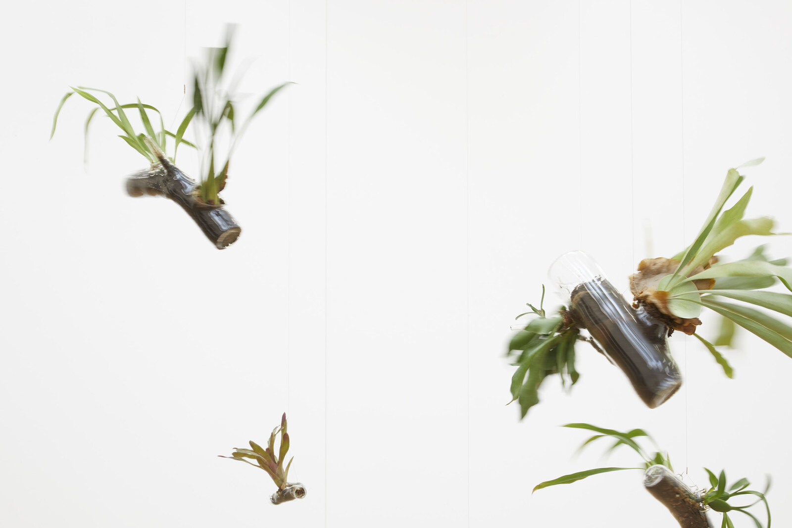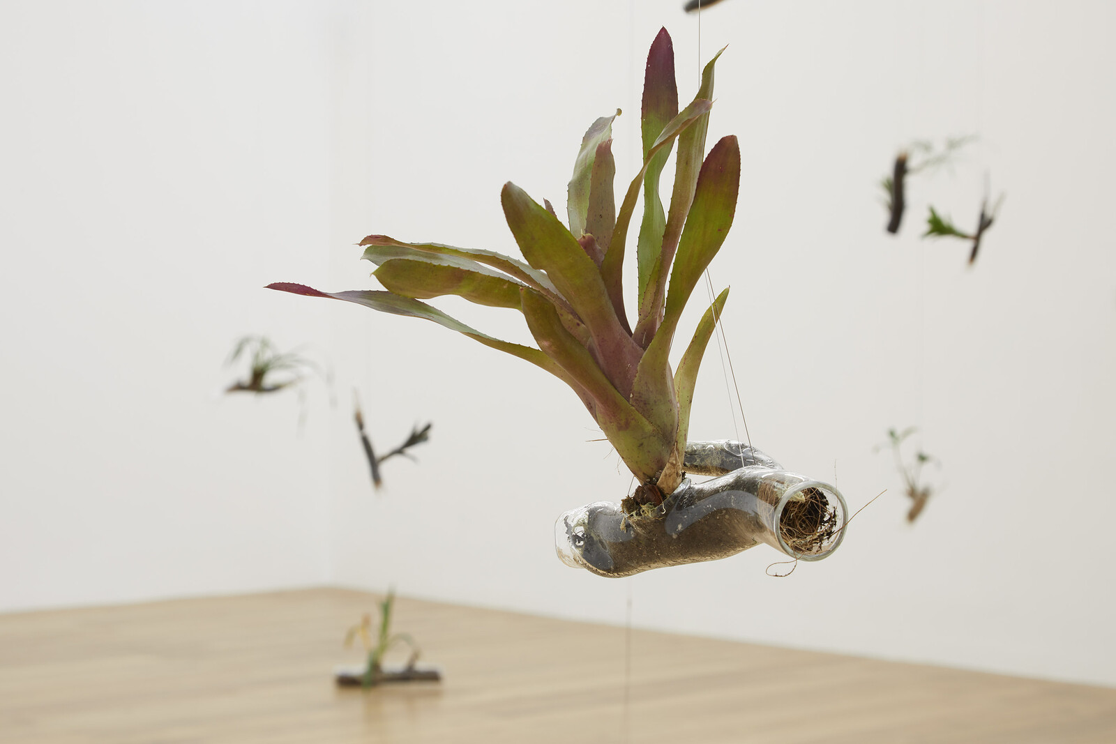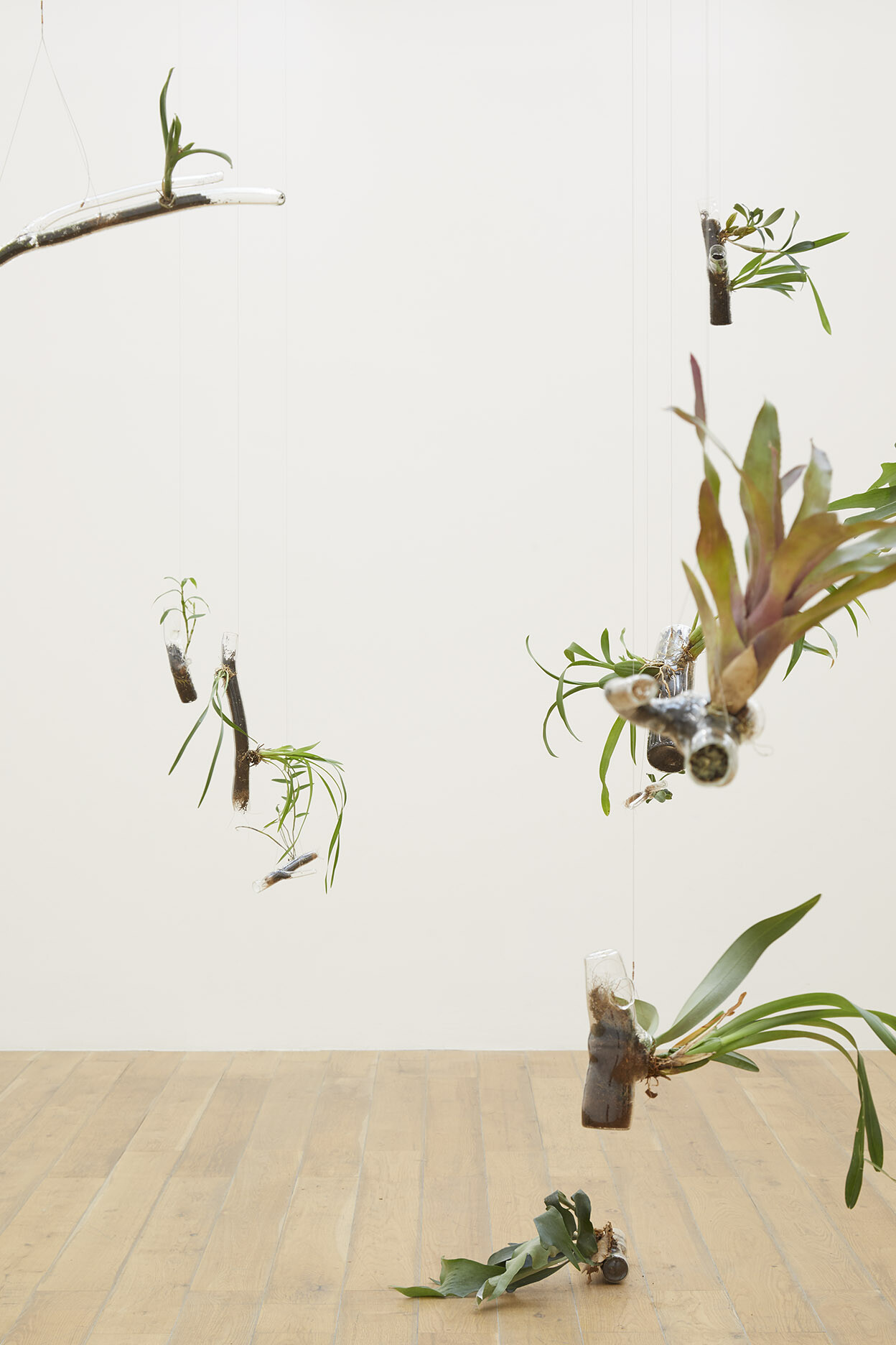 At the gallery, dozens of native plants protrude from hand-blown vases shaped like branches. Ferns, bromeliads, cactuses, and orchids sprout out of the small orifices of the transparent vessels, which are either resting on the floor or hanging from the ceiling at the height they would grow on trees in the wild, giving the impression of being in an uncanny forest where most of the vegetation has been erased. These “branches,” blown by glassmaker Jochen Holz, are delicate and convincingly lifelike. Only the flat bases of the vases, which contain the soil, confirm their handmade origins. Yet, in light of the recent developments in Brazil—where there are fears of a surge in deforestation and violence against indigenous people following president Jair Bolsonaro’s decision to hand over the regulation of forests and the designation of new indigenous reserves from the Brazilian Forestry Service to the Ministry of Agriculture, now led by an agribusiness lobby2—Steegmann Mangrané’s representation of the nature-culture dyad, its synergies and conflicts, feels a little too literal.