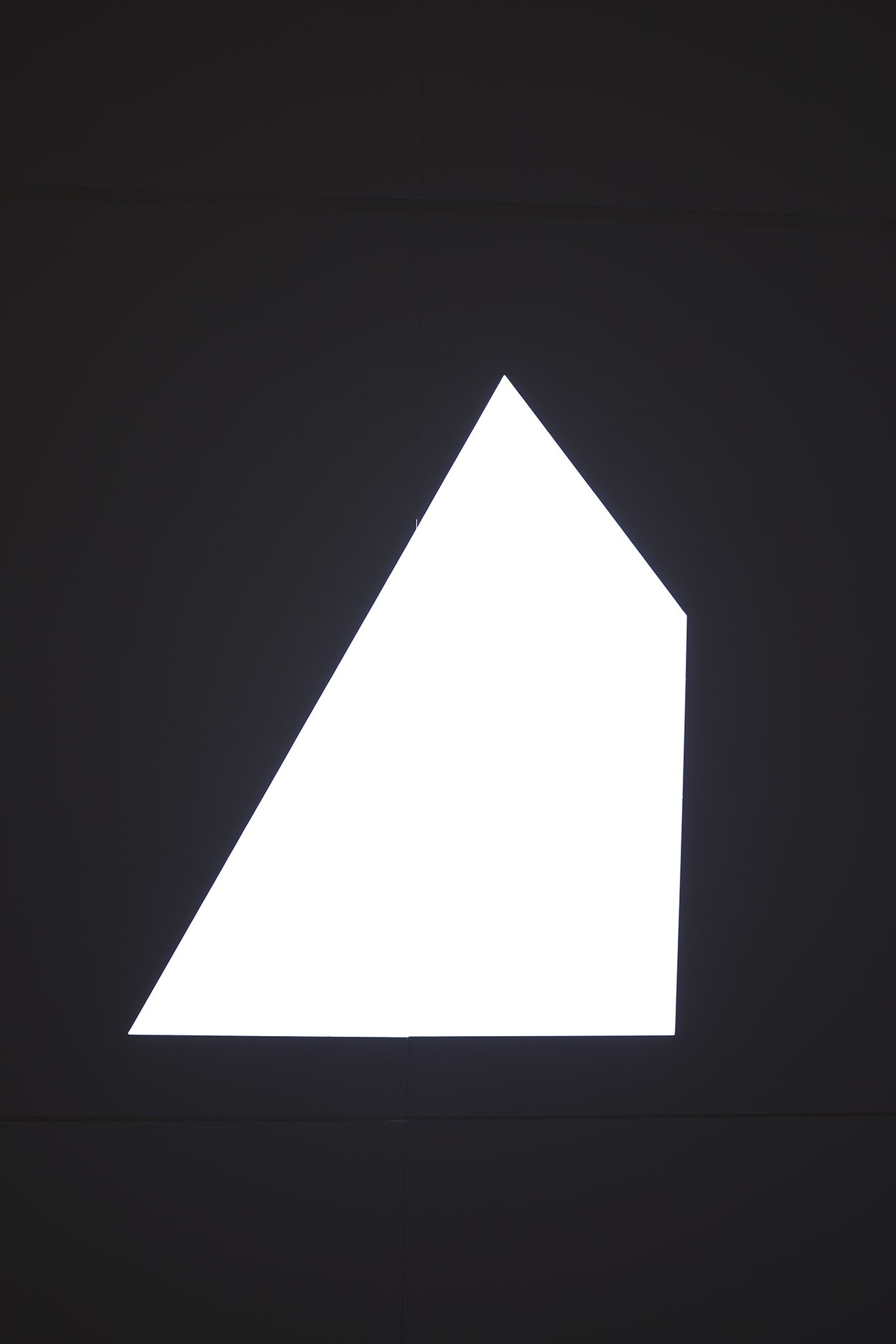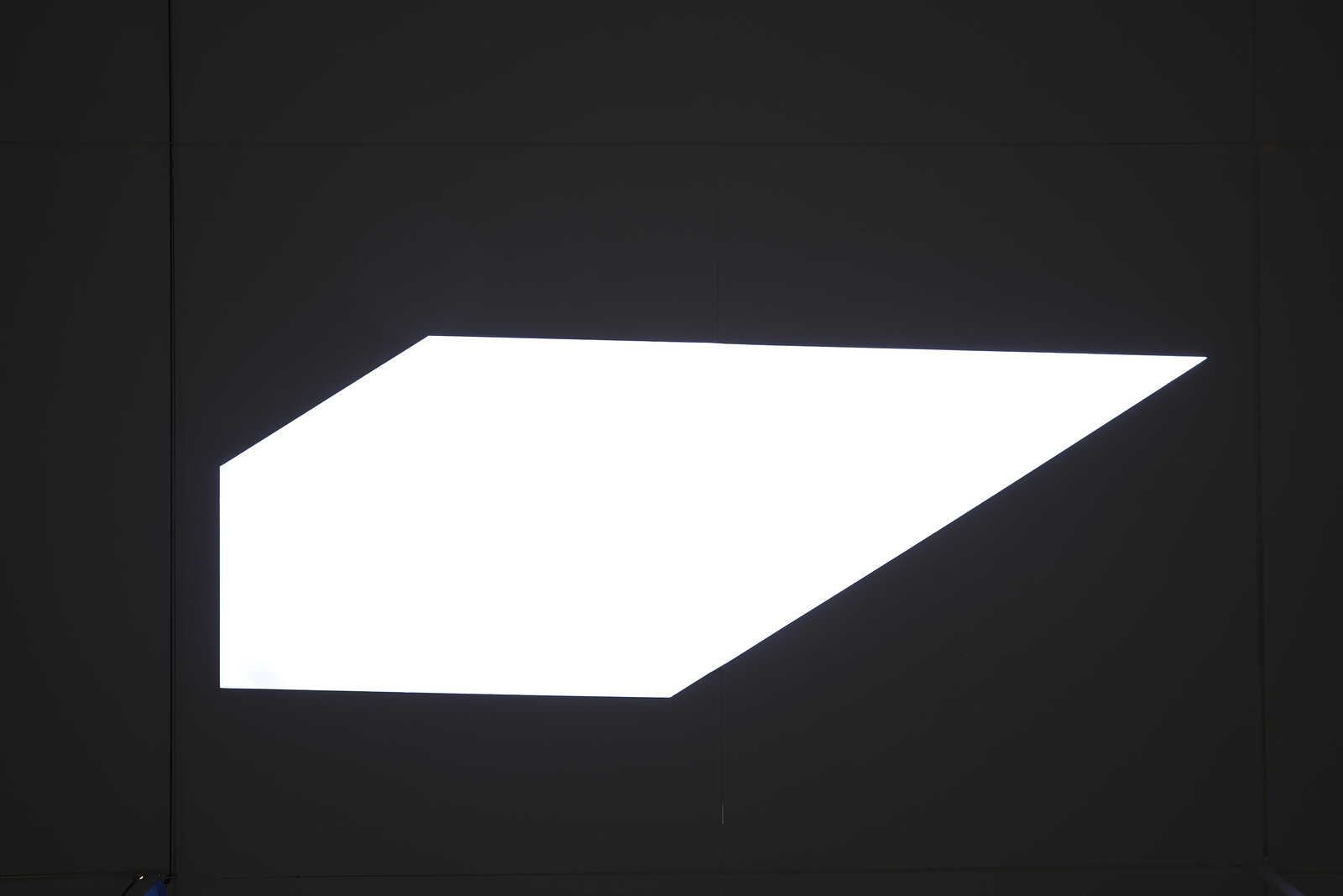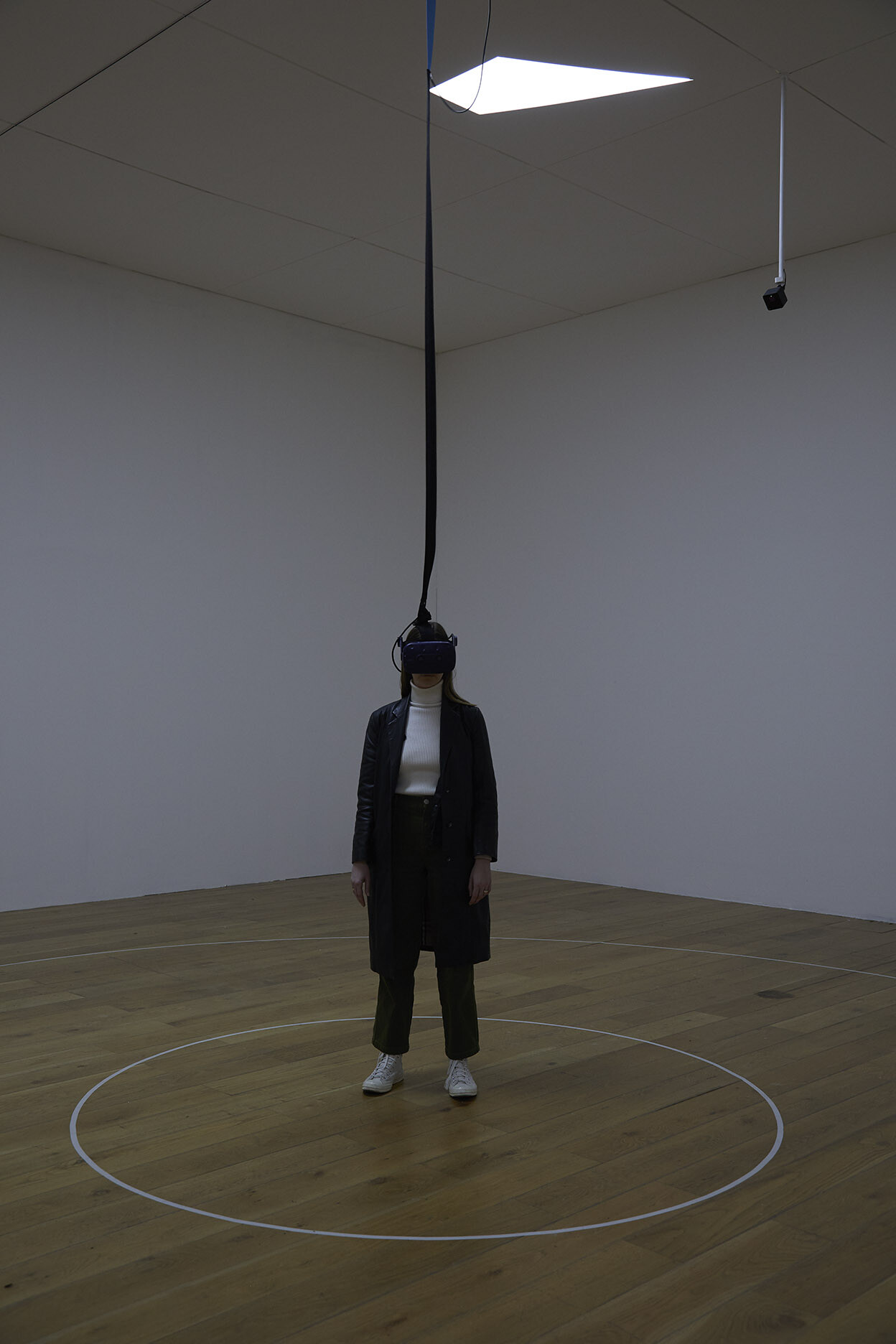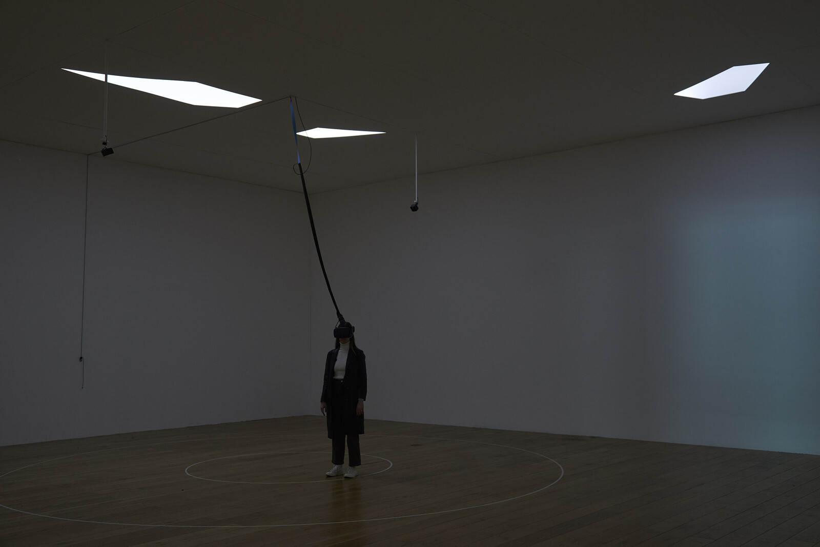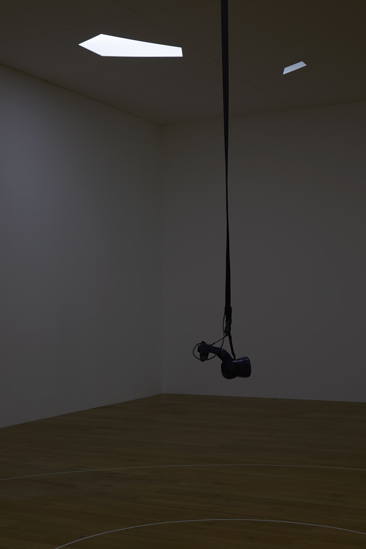 Behind the door to the second gallery, a visitor wearing a virtual reality headset is traversing the perimeter of two concentric circumferences marked in white on the gallery floor. I wait for my turn to enter this VR environment, Phantom (Kingdom of all the animals is my name) (2015). The room is dark, with only small slithers of LED light coming through irregularly shaped, polygonal cuts in the ceiling, titled _C_A_N_O_P_Y_ (2019). The lights dim or brighten in response to weather data collected from the Atlantic Forest, mimicking the real-time light conditions of the area.