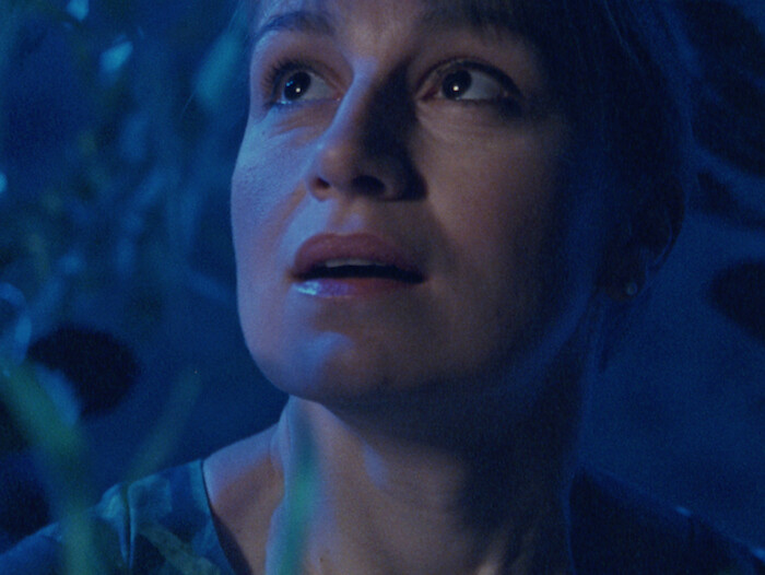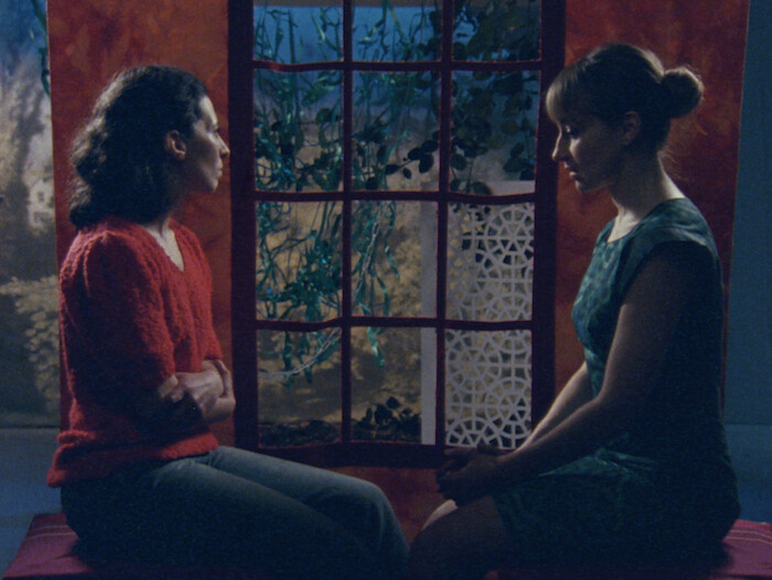 The palm tree image acts as a hinge between these first two films of Martin’s trilogy, showing two different faces of synesthesia: the first represented through the objective register of scientific re-enactment, and the second drawing out in cinematic drama the research Martin has undertaken into the real-life intensities of the synesthete’s experience. The heightened attention to tactile surface detail, suggestive lighting, and musical accompaniment characteristic of earlier works such as Harpstrings and Lava (2007) here effectively renders the emotional tone of the narrative in a higher key, revealing latent associations to cinema’s melodramatic traditions in Martin’s work which have been there all along. One might trace Douglas Sirk or Rainer Werner Fassbinder in the lush metaphors of her set pieces, but I find in At The Threshold a telenovela intimacy. Like those deft low-budget productions, Martin orchestrates and amplifies emotional range through the abbreviations of lingering close up, stripped-back sets, and washes of colored light, exerting the uncanny of familial bond and sensate connection through the telenovela’s heightened artificialities. In a memorable closing scene, this “queer place” of porous identities encounters an instance of photogénie, when the set asserts independent agency, and freestanding screens glide around the stationary stepmother, in a dance of revelation and concealment which speaks beyond the emotional vulnerabilities of Martin’s protagonist to a wider human condition, and in particular those of a sensitized affective nature, who feel as others do.