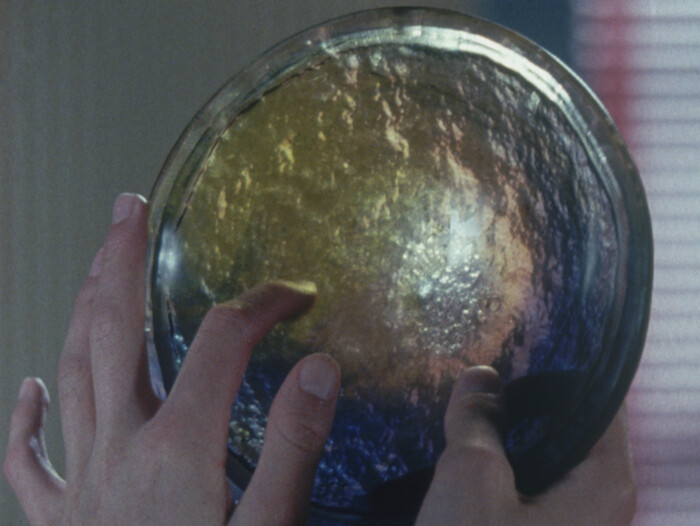 Martin has already been drawn to explore the condition of mirror-touch synesthesia in the first of a planned trilogy on the subject, Sensorium Tests, and while it takes a very different approach from its predecessor, At The Threshold deepens and builds upon Martin’s enquiry into a condition still little explored outside science. As images and framings hint throughout both films, Martin’s interest exceeds straightforward scientific curiosity, to find in mirror-touch synesthesia a compelling metaphor for the experience of cinema. Martin, of course, is not the first to explore the possibilities of an affective reciprocity between bodies onscreen and off. In his 1948 essay “Le Cinéma du Diable,” for example, Jean Epstein recognized the profundity of cinema’s synesthetic properties, writing of “knowledge gained directly through feelings, one that is immediate, practical, and supple—a kind of poetry that we acquire above all through what we see.”1 Cinema’s sensorial potential is played out in Martin’s tactile close ups on objects, surfaces, and costumes, imbuing them with the significant singularity that Epstein notes as the photogénie uniquely conferred upon things by the cinematic gaze: pregnant with undecipherable meanings and wayward energies.