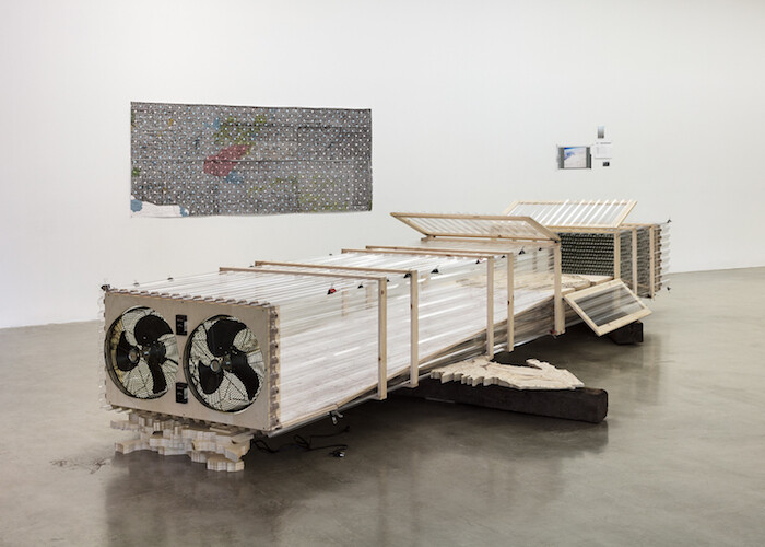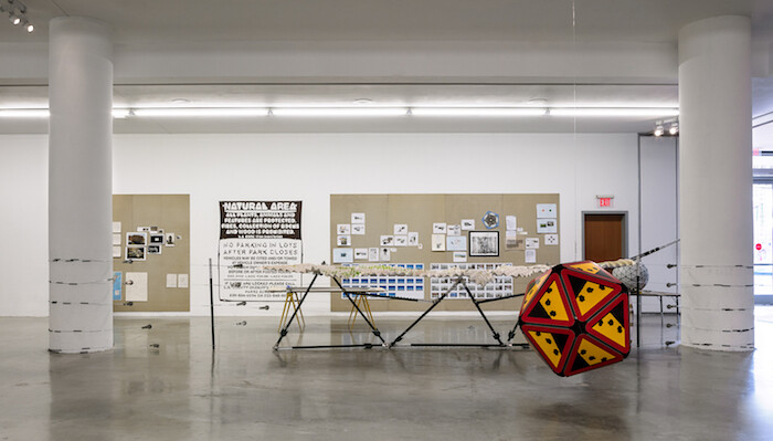 Dave Hullfish Bailey’s “Hardscrabble” is a lesson, too. The Liberty Valance schoolhouse scene is projected onto the back of a full-size model of the Sputnik satellite. The ball-like surface is comprised of triangular panels, after geodesic architecture and design—construction that approximates the strength and realism of spheres and curves using only straight lines: the way the US Constitution is described as a “frame,” to be filled with specific cases; the way arcane disciplines are available to the layman only in outline. The artist is expected to be a generalist, to know a little about a lot, including that their image of any one issue is lower-res than that of experts. Bailey plays on this with displays of graphs and maps, folded or pixelated, in a way that asks just how granular—how scalable—are laws and other boundaries. Clippings pinned to sheets of insulation link the tensegral structures of Drop City, the commune in southern Colorado; the Pentagon; and a school table with the same pentagonal form. A pro-fracking mailer follows records of Colorado’s prevailing winds.