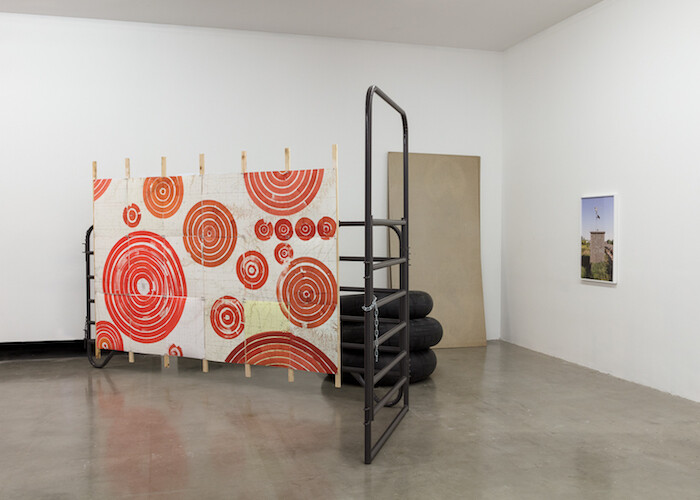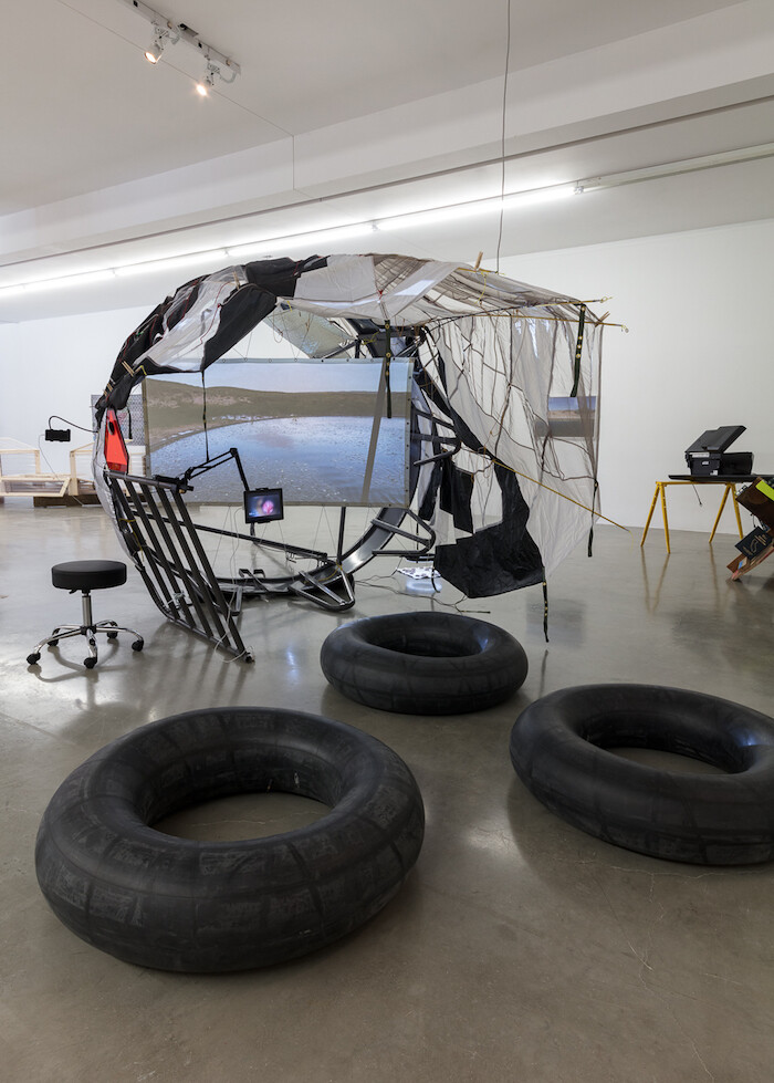 Perhaps this is why, under a circular reading lamp, sunflower seeds rest in small pucks of soil. (At the time of writing, there are no sprouts.) This micro farm echoes, on the other side of the installation, several inflated inner tubes, like germination stations at human scale. These accompany a rocket booster-like shell made from a nylon tent and a livestock hay feeder (all brand new); a projection inside this canopy shows an unknown body of water. “Hardscrabb gle” skims over named places—Slab City, Drop City, Ogallala Aquifer—yet it is devoid of characters: its landscape shots and maps are armatures instead. In a back corner lean three full sheets of insulation, ready to extend the gray bulletin board that already covers one gallery wall. The gritty reality is that the idealism of the frontiersman, the free spirit, is necessary to, yet necessarily excludes him from, the society he protects and makes possible. John Wayne’s character in Liberty Valence, just like in The Searchers (1956), saves the frontier family, yet is not allowed to join it. Bailey couples the bitterness of John Ford’s longing for an impossible West with the similarly groomed outsider romance practiced by Smithson. There, the lack of convention is the convention; the artist chafes against self-imposed strictures, yearns for what they imagine were freer days.
