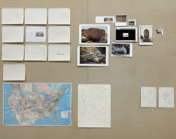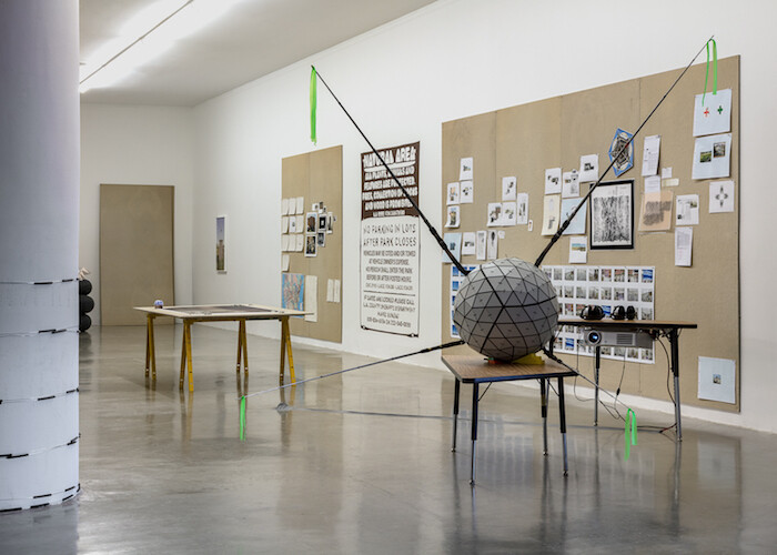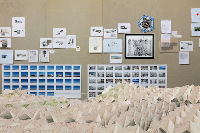 The show is grouped in four zones, each relating to a project about a different “planned community” or off-grid experiment in the American West. They don’t exactly correspond. It’s as if, just as the “planned” community resists the conventions of city planning, so does Bailey’s show try to circumvent certain concessions to legibility. The area dedicated to the geodesic Drop City, for instance, comprises maps intricately, regularly folded into peaks and valleys connected edge to edge and supported by a construction of steel wire and steel fence posts, as well as other maps on tables, the Sputnik model, and the John Ford clip.